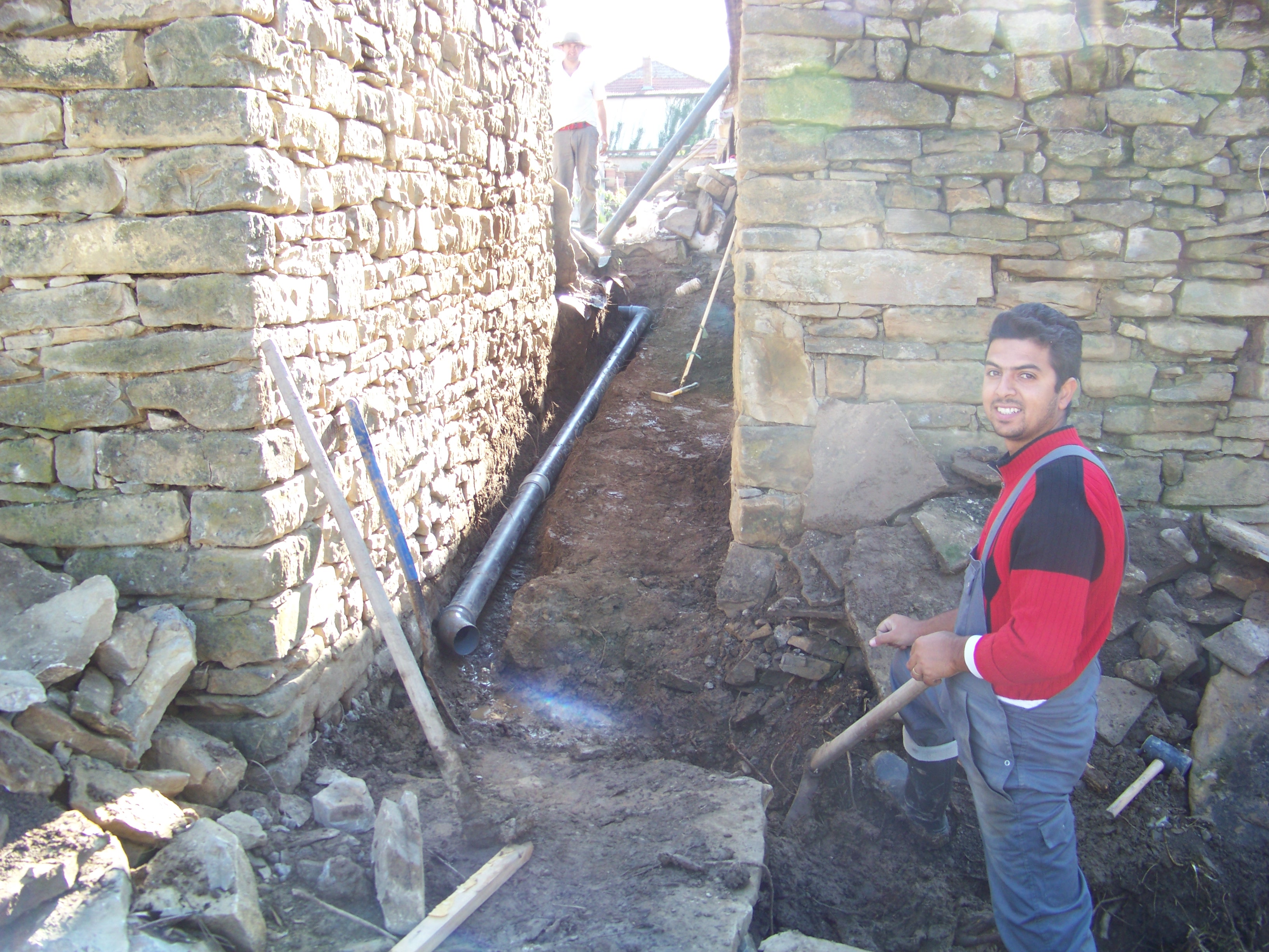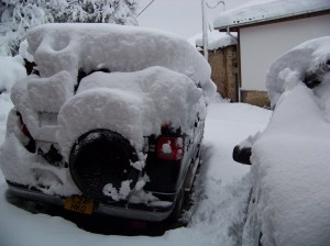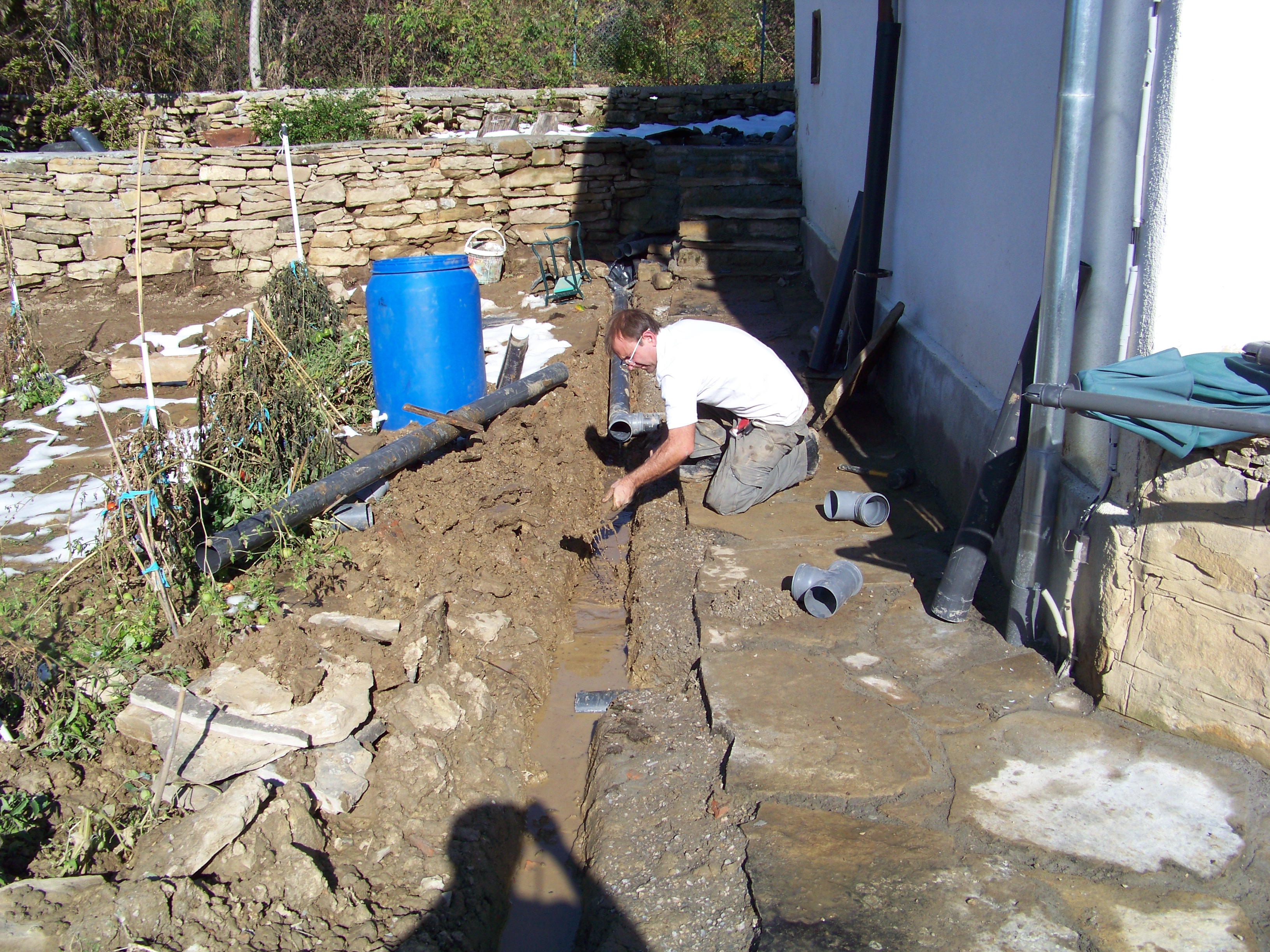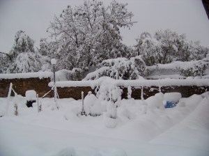 Amazingly, the next day was warm and sunny. David continued his tree-clearing efforts, while the snowplough, hero of the hour, managed to clear the lane beyond the village, but couldn’t get over the bridge. By week’s end, the snow had gone, the Turks had reappeared, and we were digging a drainage ditch. Naturally, the melting snow kept filling it up, so we were, in effect, digging underwater. Still, the pipes went in first time, a Ritya miracle, and the garden began to dry out.