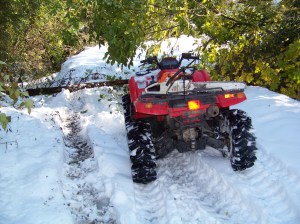 We set about digging paths, collecting snow to melt for water, and firing up the camping stove for tea. David, heroic on his quad with a chainsaw, vanished into the distance to clear the road. Power was restored later that afternoon.