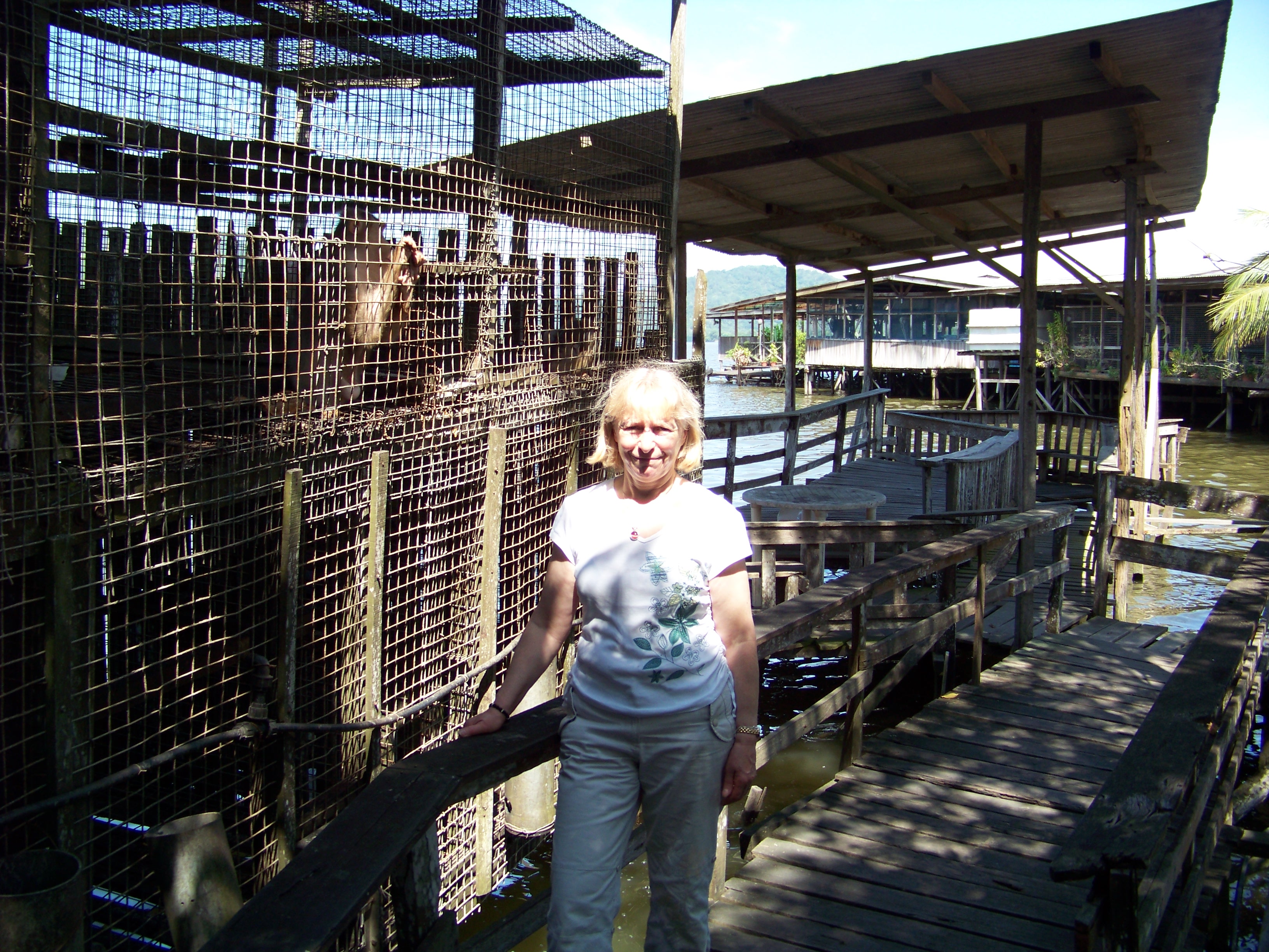 A winding single-track road took us past prawn farms, their water wheels churning away like oversized hamster toys. The restaurant itself proved to be a charming wooden structure on stilts, stretching out into a glassy lagoon fringed by mangroves. After confirming the evening opening hours and admiring tanks of live seafood that looked like they’d been auditioning for The Great Escape, we noticed a few monkeys in cages just outside.