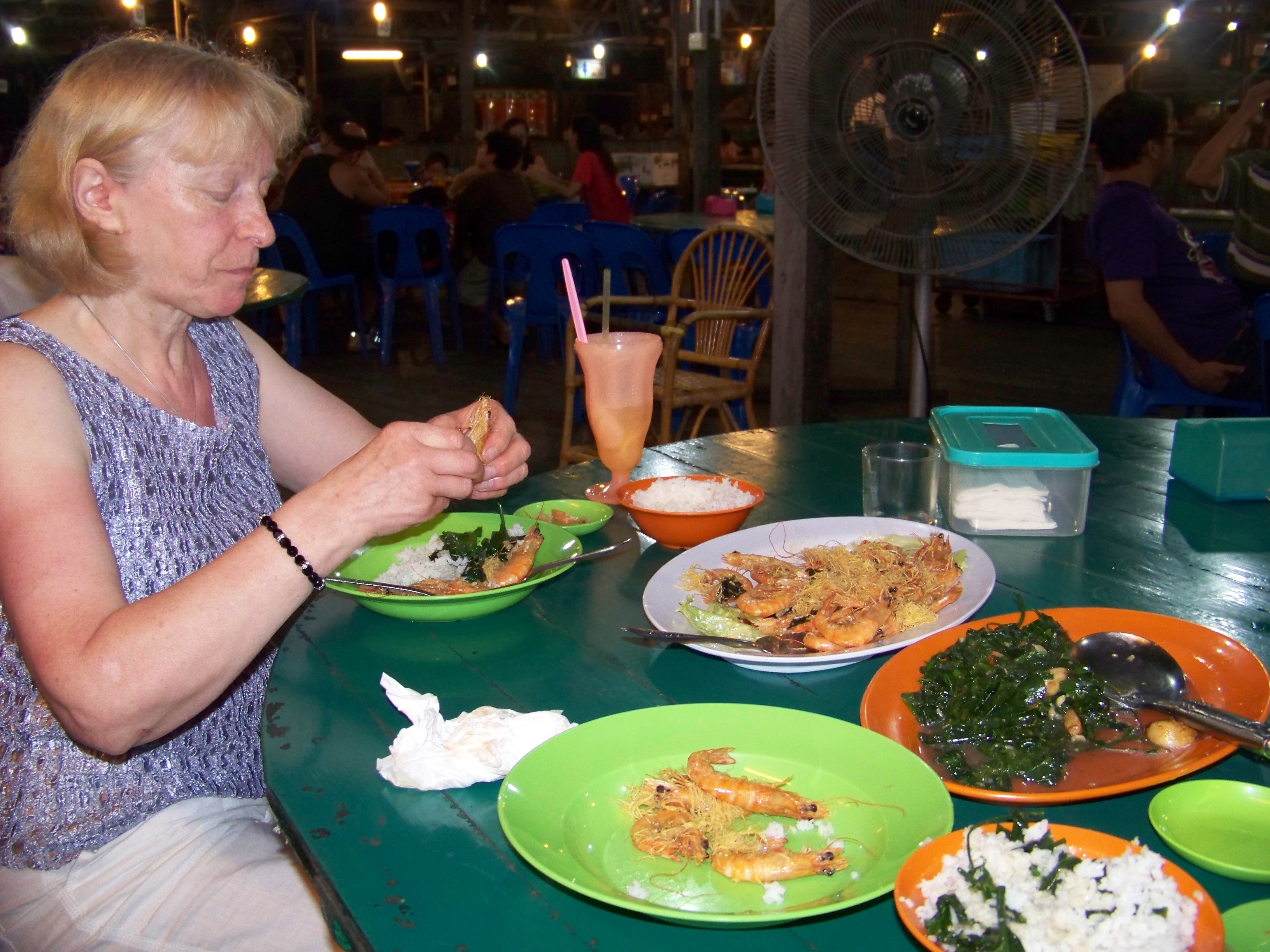 Returning to the lagoon restaurant from the morning, we found it heaving with diners but were shown to what we suspected might have been “our” table by the water. With no English spoken by the waitresses, who seemed afraid to approach us, we tracked down our earlier friend to help order butter prawns, fried rice, and steamed vegetables. I finally had my first beer of the holiday, and we amused ourselves by observing the enormous family groups dining nearby, one clan numbered over twenty people, spanning three generations.