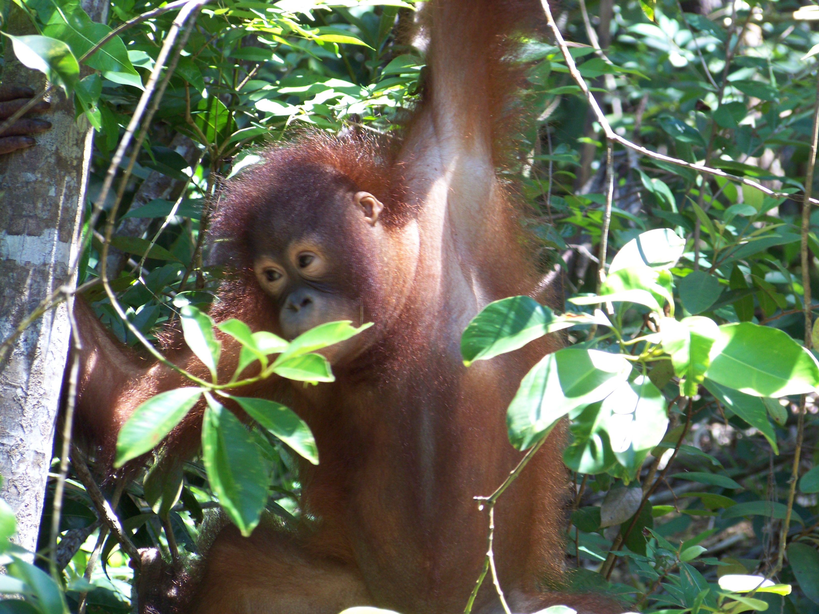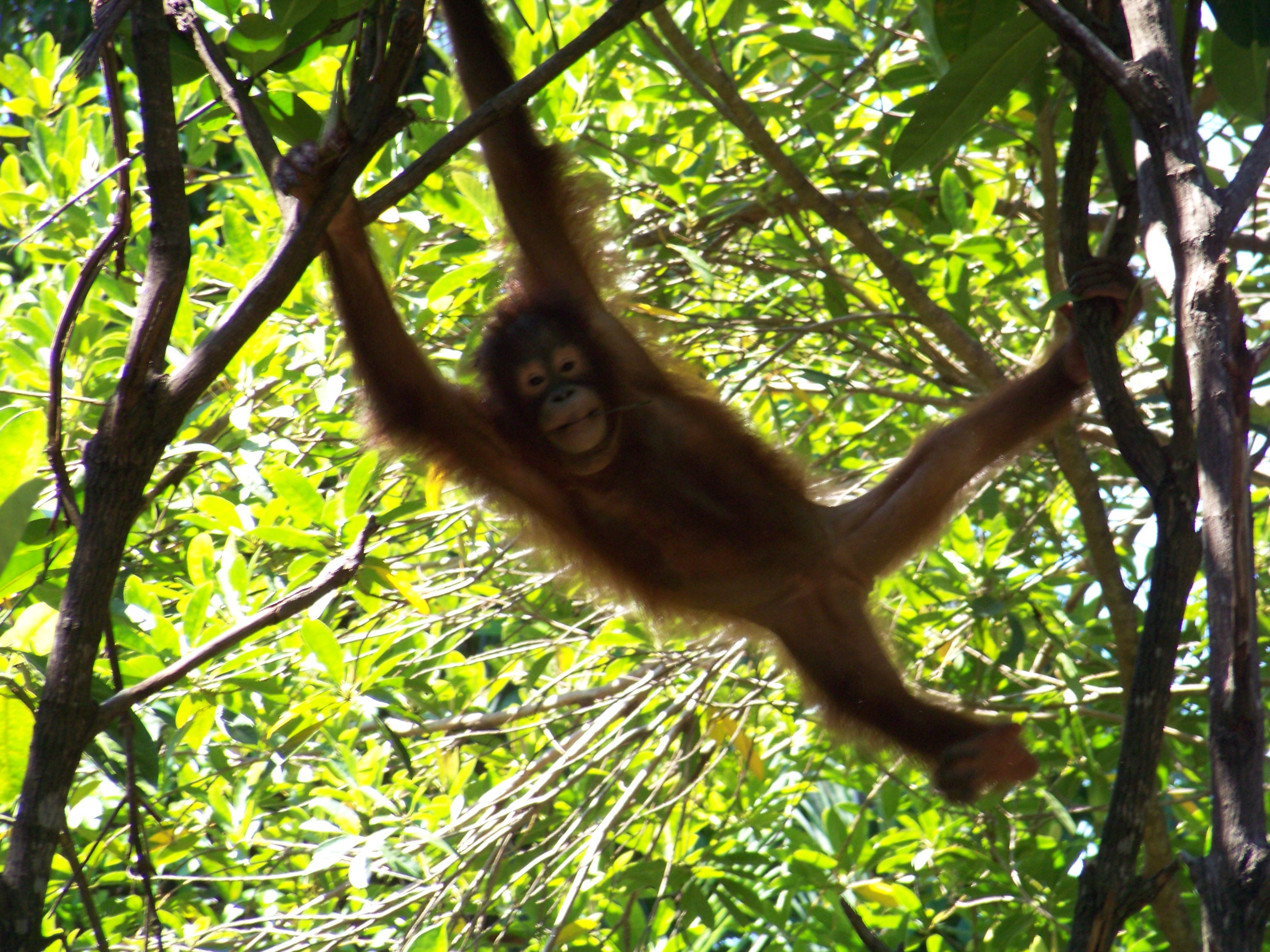 Sue and I then strolled to the Activity Centre for our second round of orangutan observation and feeding, followed by a canopy walk. The group this time was substantially larger than on our previous visit, which seemed to make the apes suspicious. They lingered aloft, peering down at us with all the enthusiasm of a cat confronted with a bath. Eventually, as the heat and humidity began to melt the guests, who dropped away one by one, the apes descended, possibly sensing that we were now sufficiently tenderised.