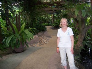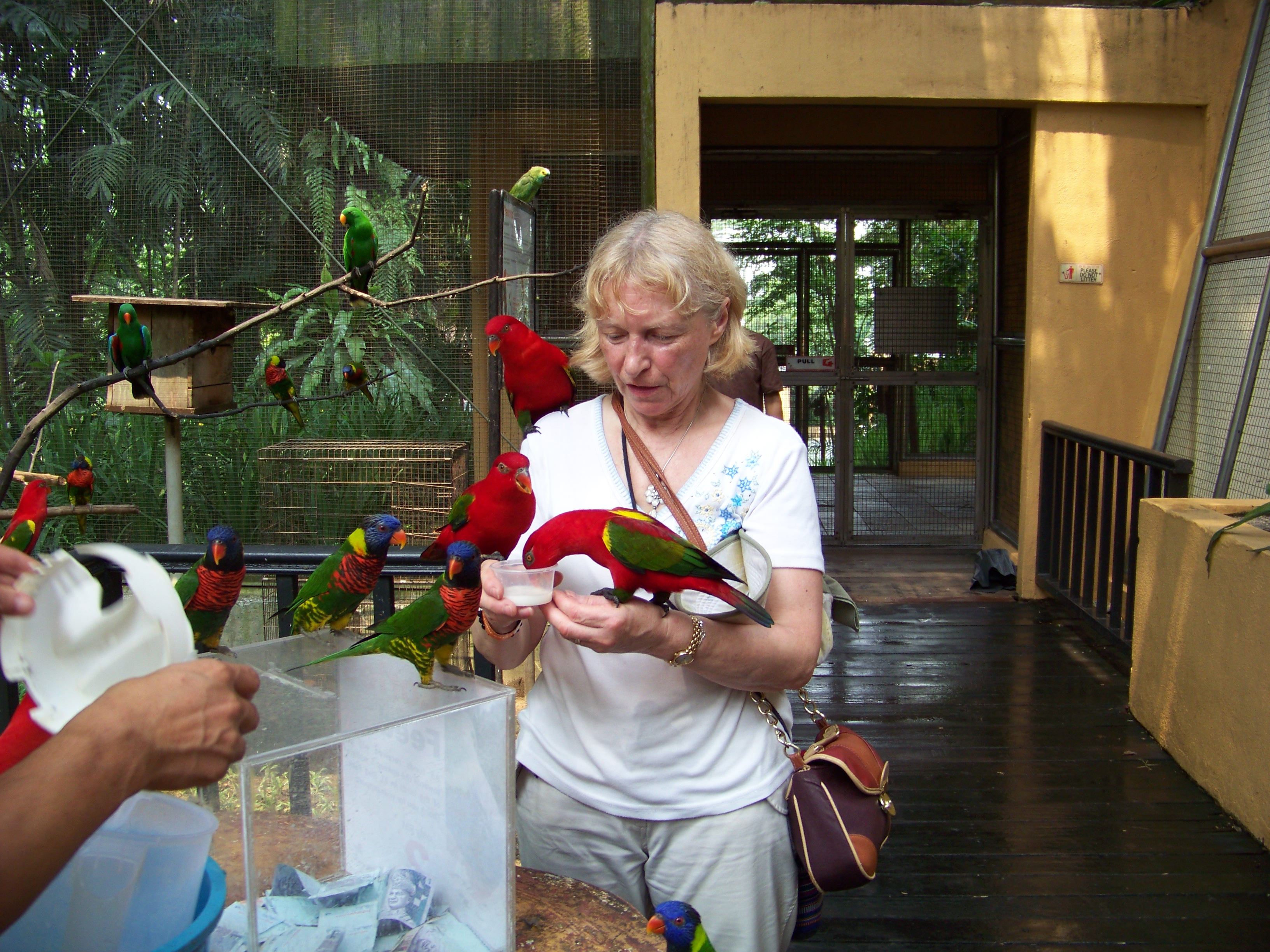 Revived, we tackled the final stretch, trudged up the hill, bought our tickets, and stepped inside. The place is vast and teeming with extraordinarily tame birds. While waiting for Sue outside the ladies, I found myself in a silent staring contest with several storks, each apparently trying to work out whether I was edible. A brief tropical shower forced us under a gazebo beside a waterfall where pink flamingos waded with theatrical grace. Once the rain cleared, I snapped photos of Sue, now adorned with a living necklace of parakeets. Two happy hours later, we finished with icy fruit drinks and monumental fruit sundaes.