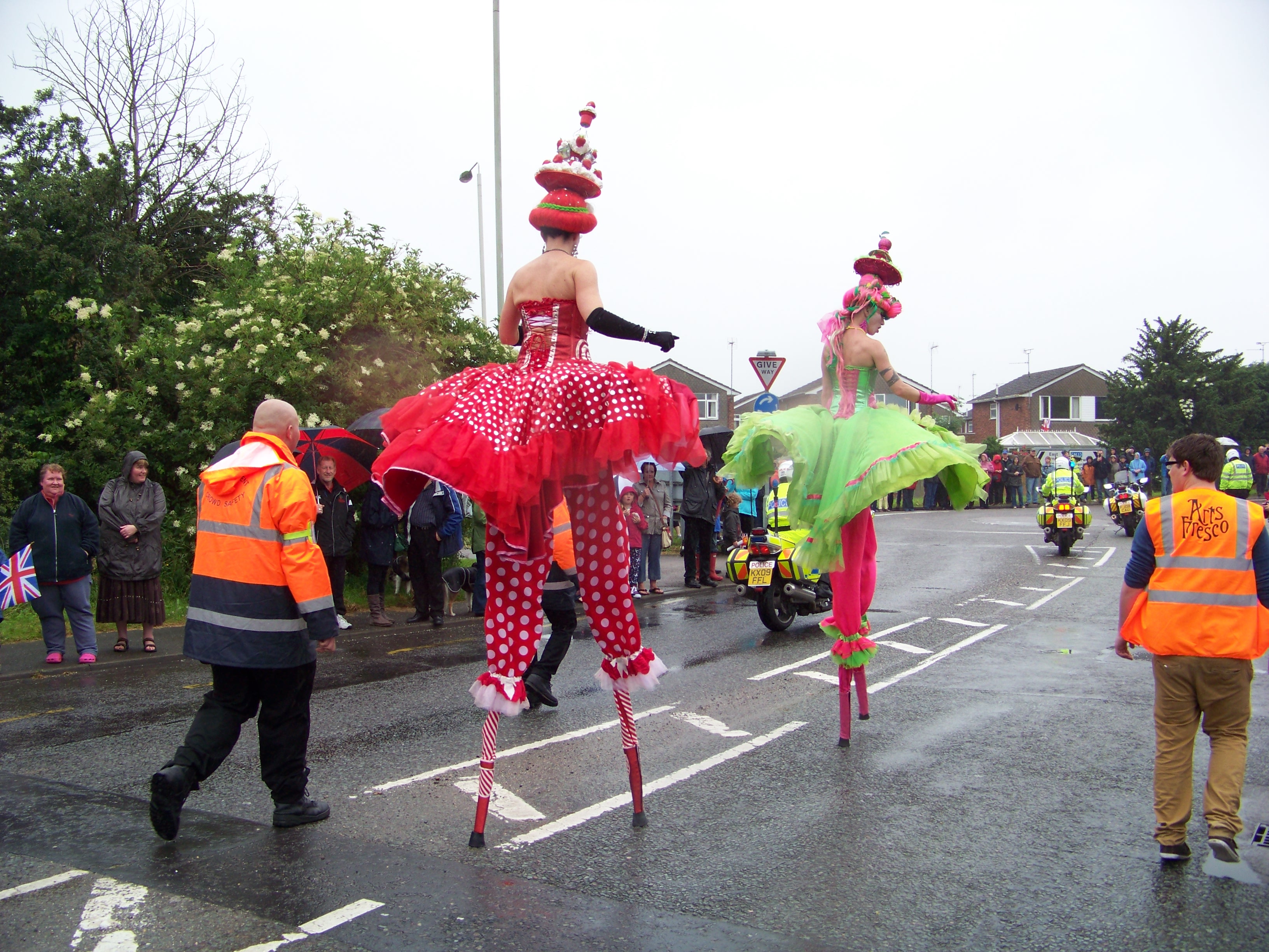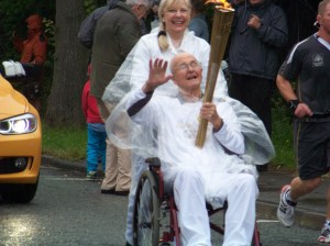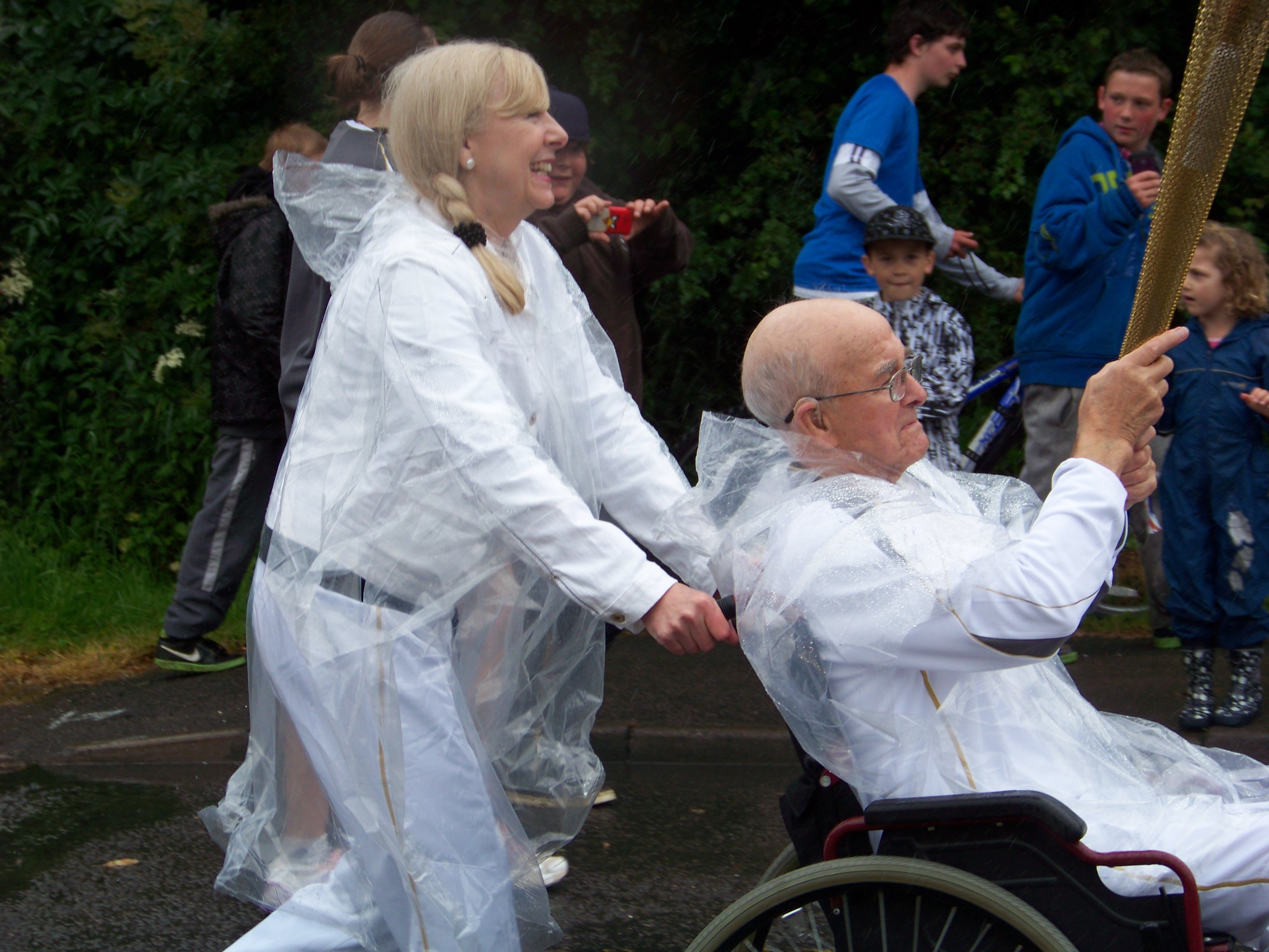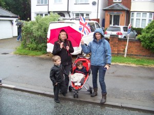 Yesterday, the Olympic Torch Relay came through Harborough. Charlotte brought the boys over, and we joined the crowds on Coventry Road in the pouring rain. All the schools had closed early so the children could watch, though I didn’t spot any from Farndon Fields. Perhaps they’d already been marched back to class, soggy as drowned rats, while the headmaster popped out to say hello to the dryish grown-ups.