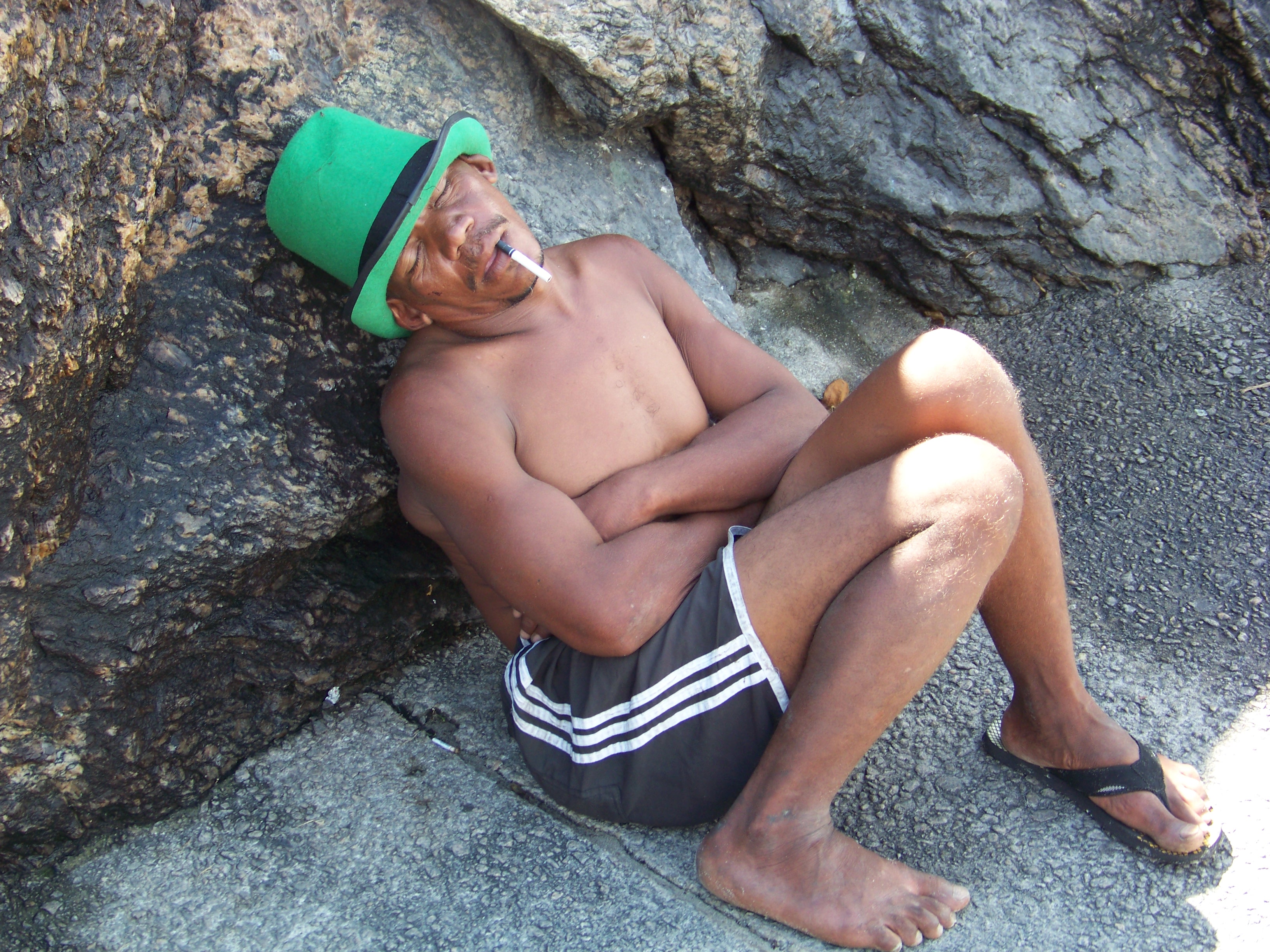 Sue was keen to explore the cliff path and watch the locals fishing, so the moth and I tagged along. On the way back, I spotted a chap asleep against the rocks, sporting a green Leprechaun hat and a lit cigarette balanced precariously in his mouth. I’m convinced the photo I took could adorn the cover of National Geographic. With luck, it might also fund my next cruise.