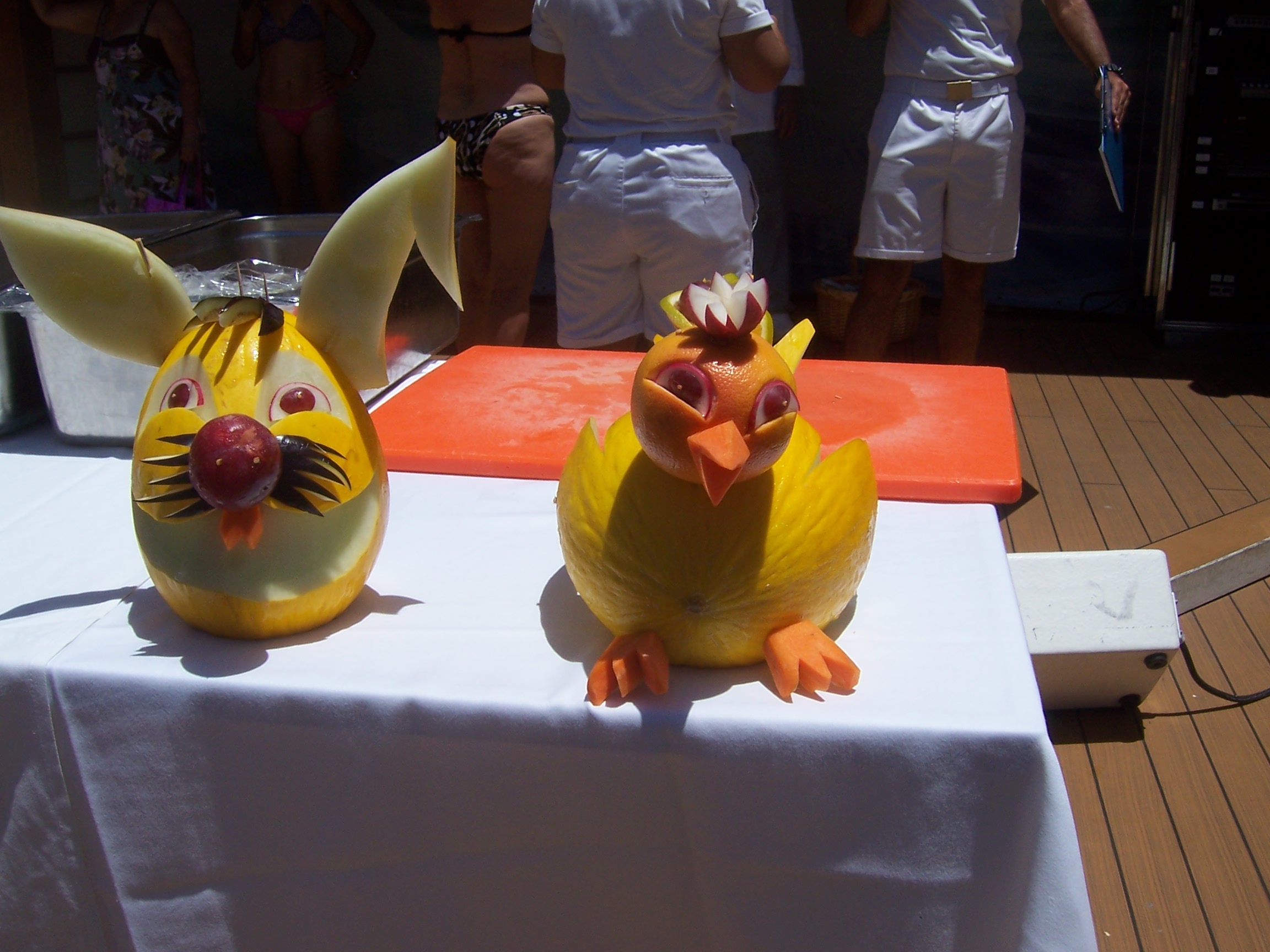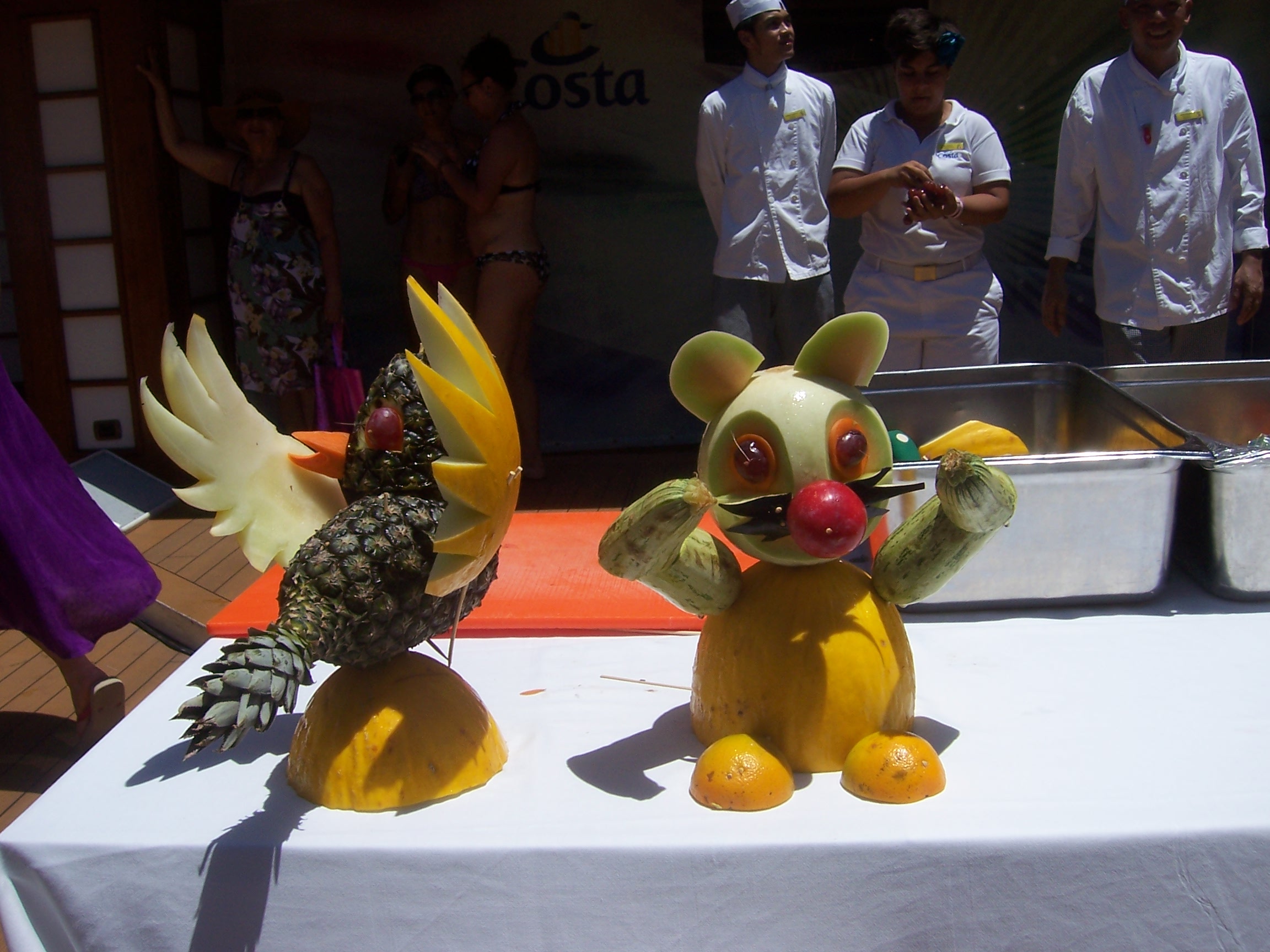 From there, Sue and I watched a fruit-and-veg carving exhibition courtesy of the ship’s Filipino chefs. Armed with pineapples, melons, and apples, they produced works of art in minutes, far superior to anything I could manage with a paring knife and a potato.