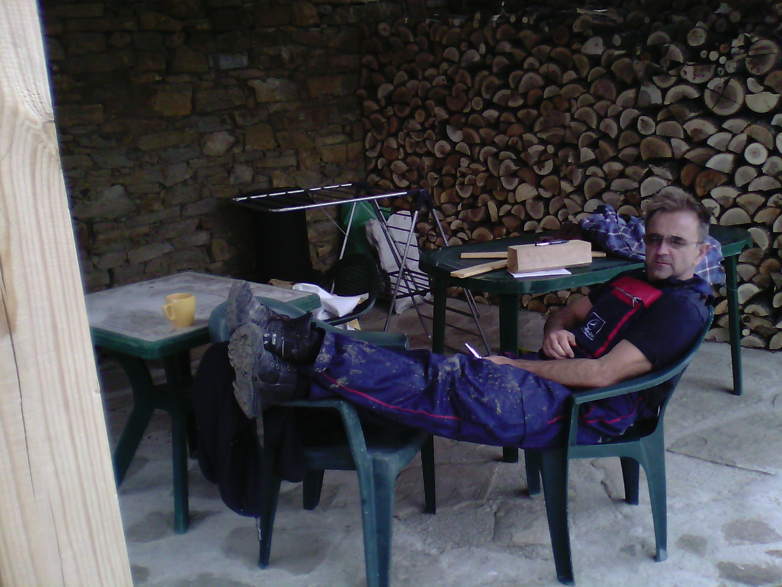 Sevdolin set to work on the wood store roof, while David and I tackled the house roof. My task was building up the apex at one end; David busied himself coating rafters with beetle killer after reinforcing them with nails. Trouble was, the timber was so hard it mocked his hammering, bending nails with ease. Eventually, he resorted to drilling every hole first. Slow going, but effective.