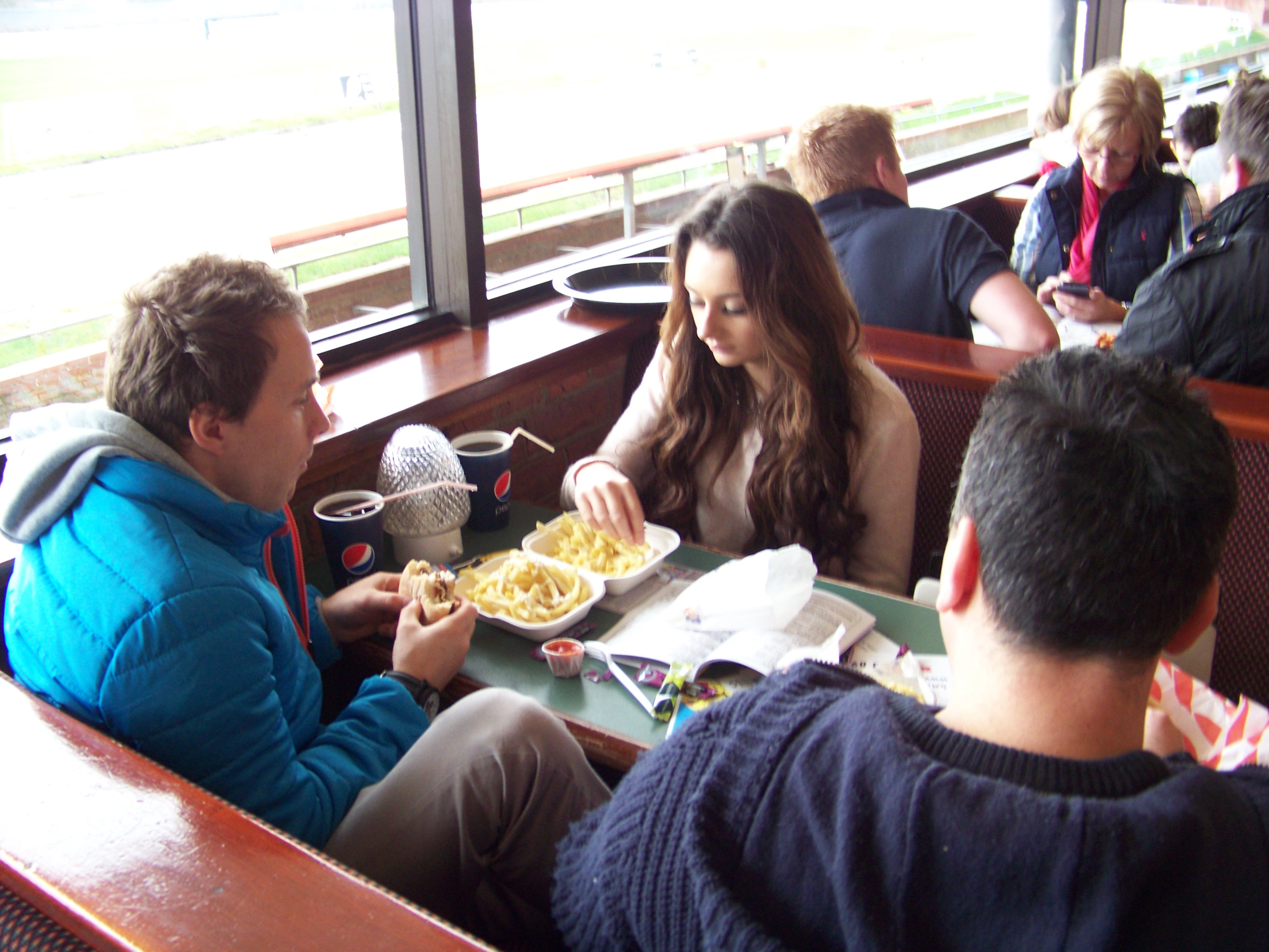 After queuing for about 15 minutes to get into the stadium, we found a couple of tables in our preferred spot. Sue and I handled the food orders while Suraj took care of the drinks at the bar. Running like a well-oiled machine, the Palmer Team was the first to be tucking into our meals, leaving plenty of time to study the form and pick our potential winners.