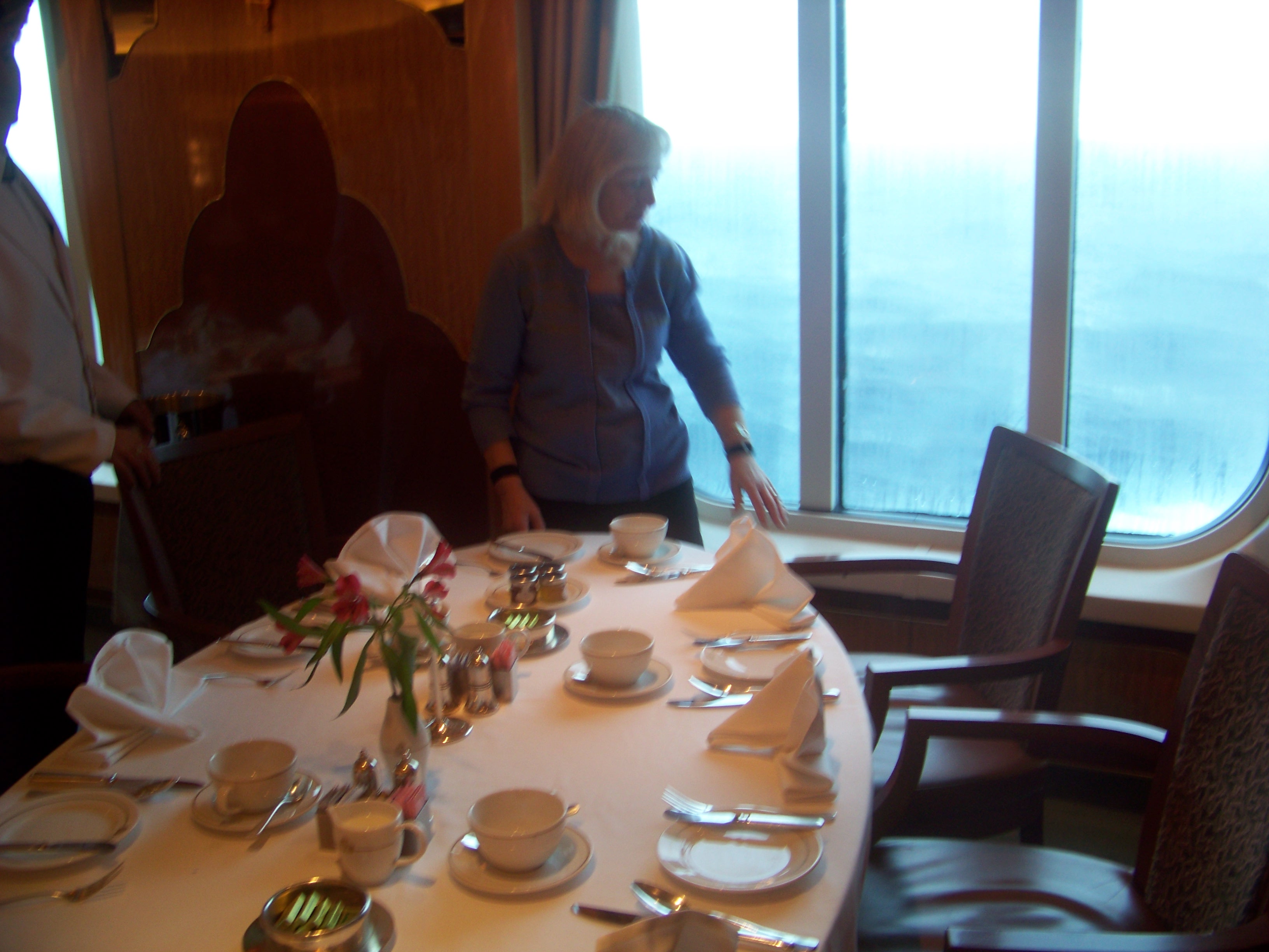 100_5338As the performance ended, the ship’s motion intensified, and our charming compere delivered the somewhat ominous news that tomorrow’s performance of Vanity Fair might be a washout thanks to the unpredictable sea conditions. Rather than risk any potential mishaps at the Grand Ball, where dancing on a moving floor could easily turn into an accidental game of bumper cars, we decided it was wiser to retreat to our stateroom while we were still upright and coherent.