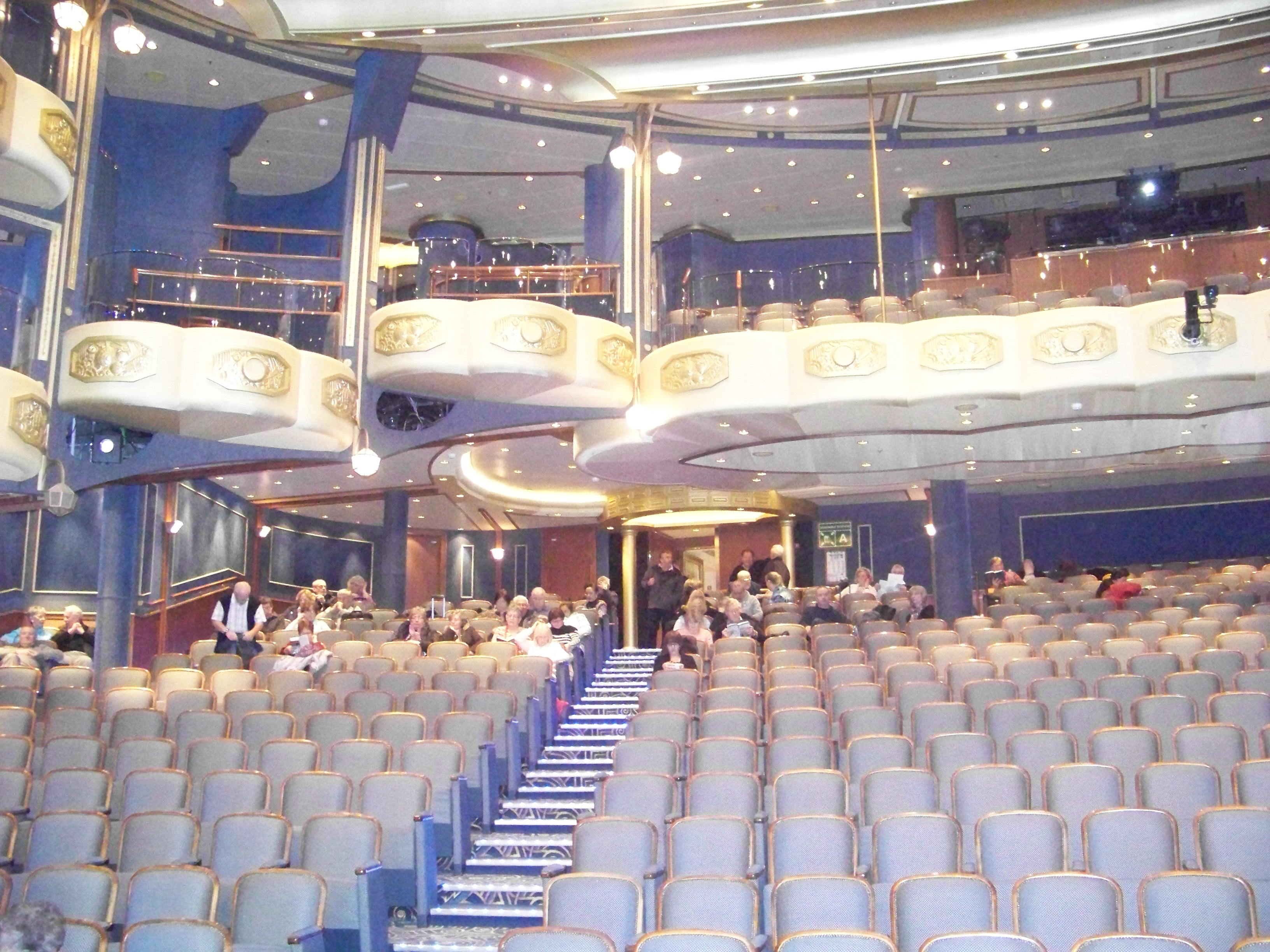 100_5281Sue, feeling a bit more chipper despite the ship’s erratic swaying, decided to brave the evening show in the main theatre. The entertainment featured a singer-guitarist from Indiana belting out a medley of tunes from the ’50s to the ’70s. While Sue was tapping her feet and humming along, I must admit I was less than enthralled; it wasn’t quite my cup of tea.