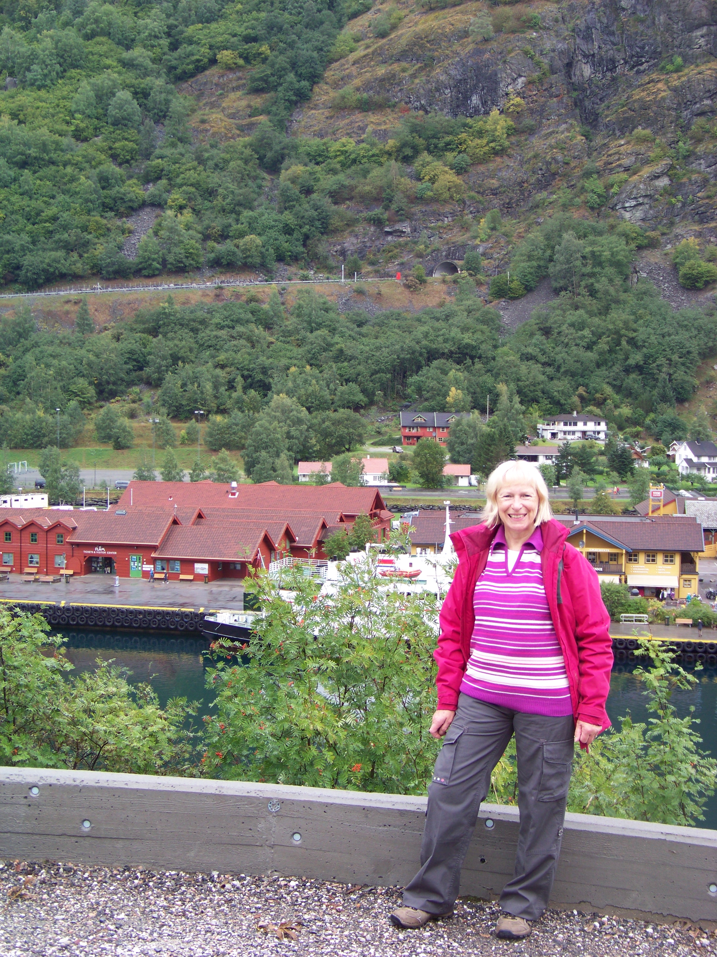 Sue was waiting for me on the quay as the rain began to fall. We quickly popped into some of the shops to peruse their tourist wares before boarding the ship. Sue headed straight to the restaurant while I took a quick shower. As the ship began to leave port, Sue found a sunny spot to watch the scenery pass by. I, on the
