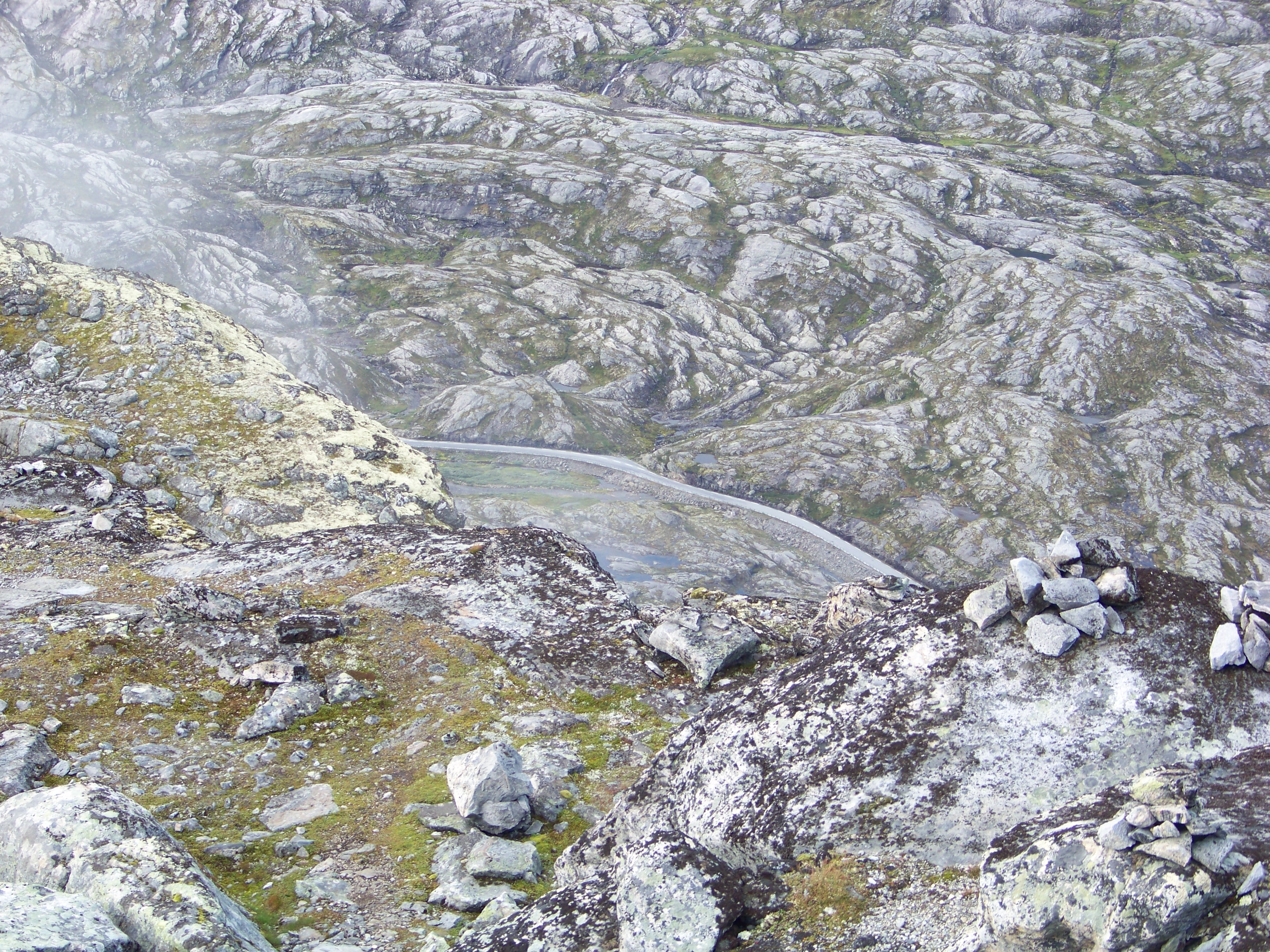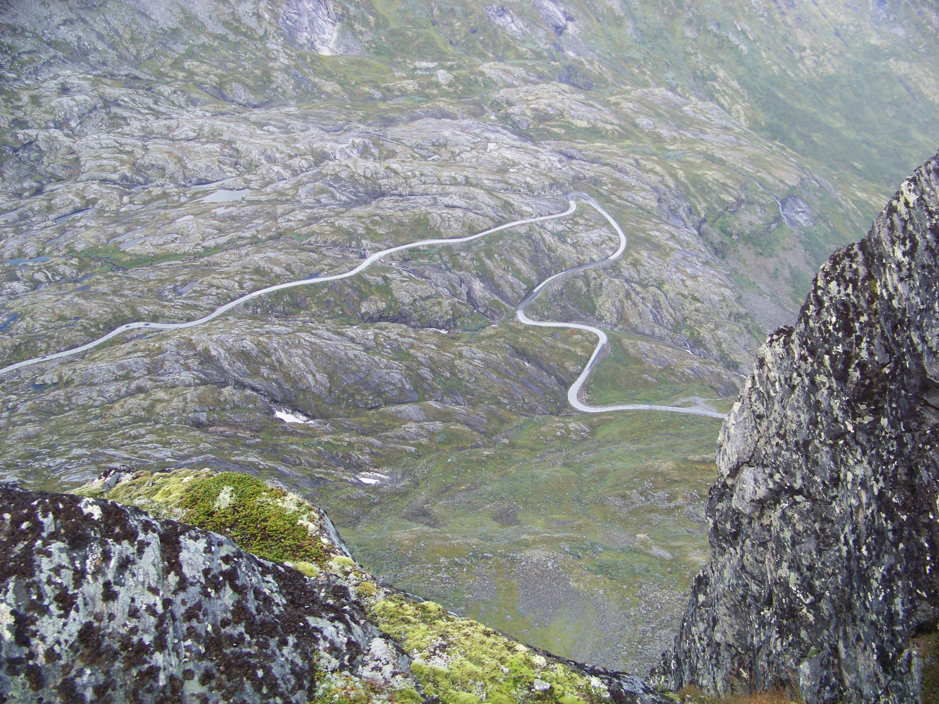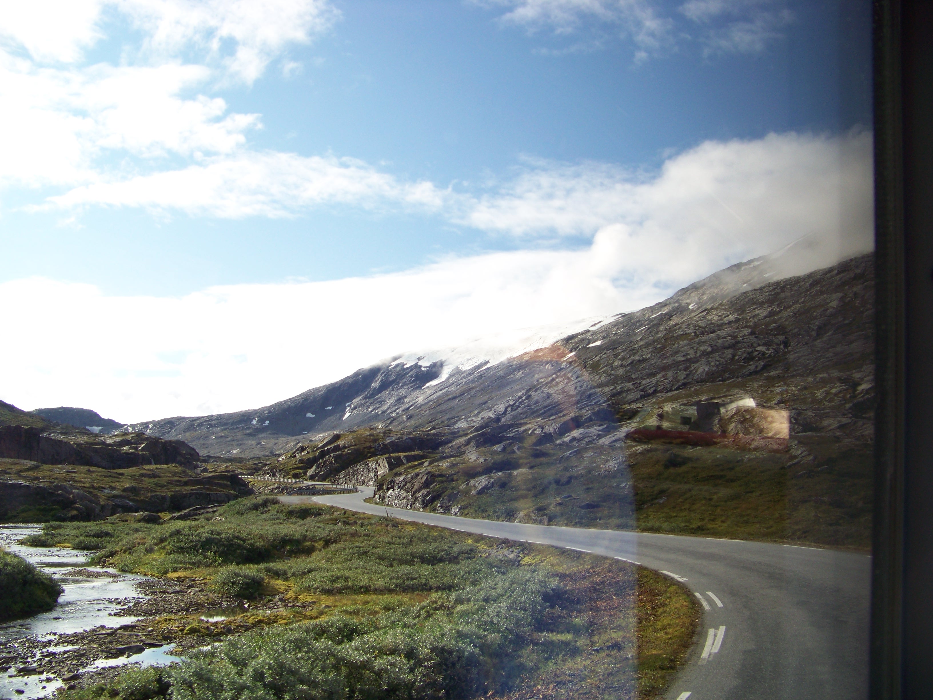 Winding our way through a series of hairpin bends, we found ourselves climbing well above the surrounding mountains of the fjord. In fact, that large, jagged peak I’d assumed would be our destination next to Geiranger was soon well beneath us. We made a brief stop for photos, looking down at the town and our ship, which now looked like miniature toys scattered in a model landscape. Up we went, higher and higher until we finally hit the snow line.