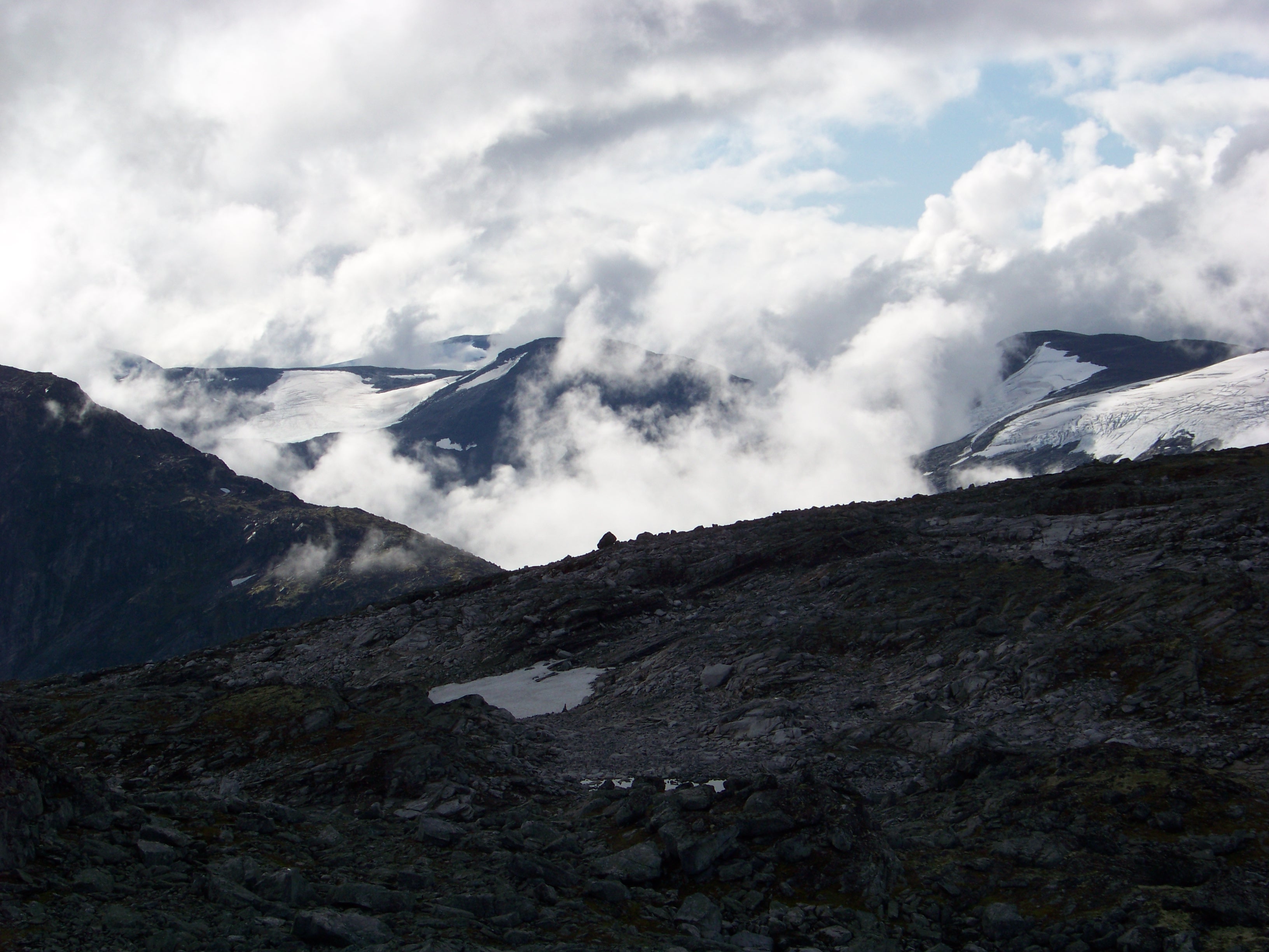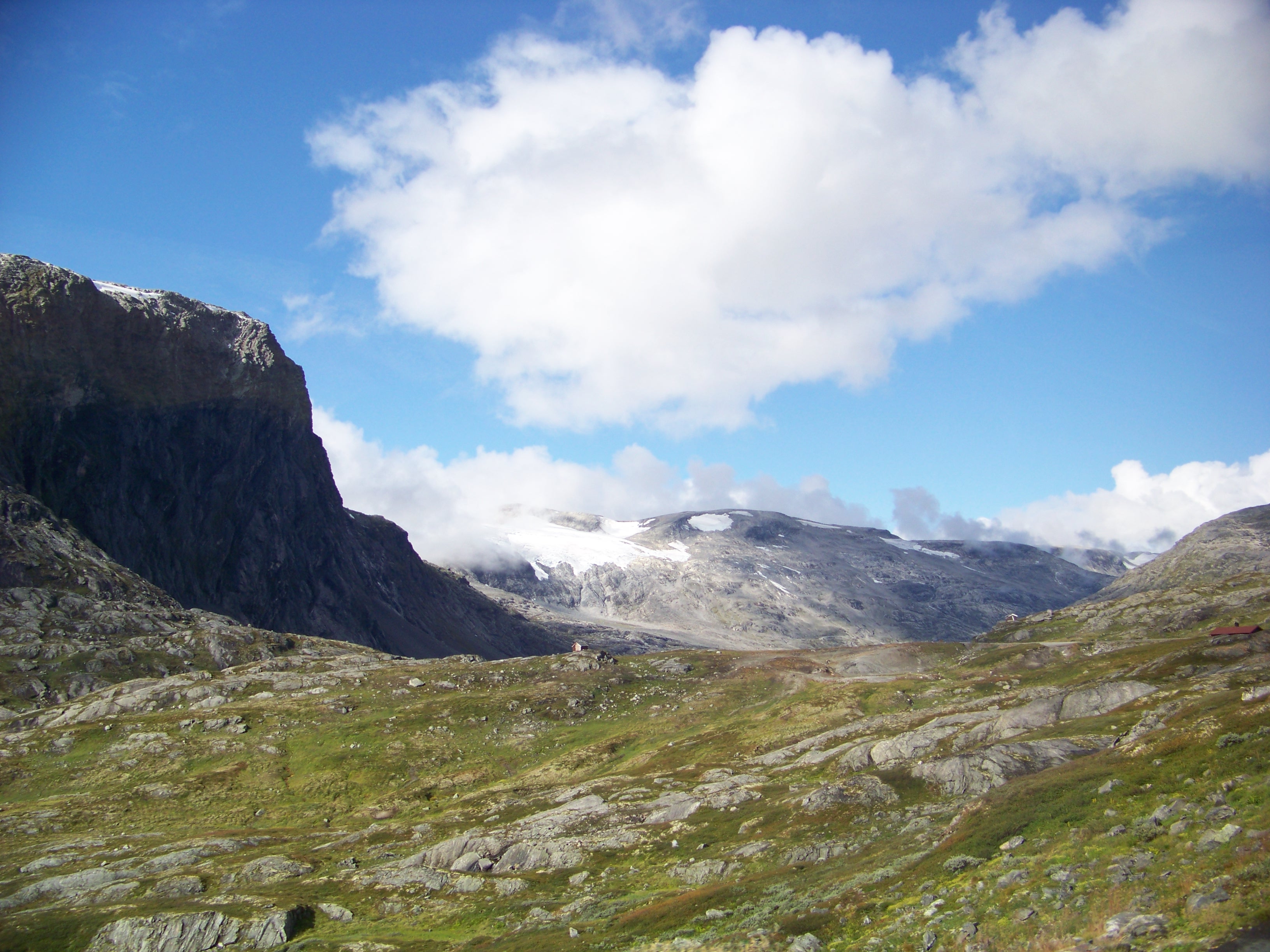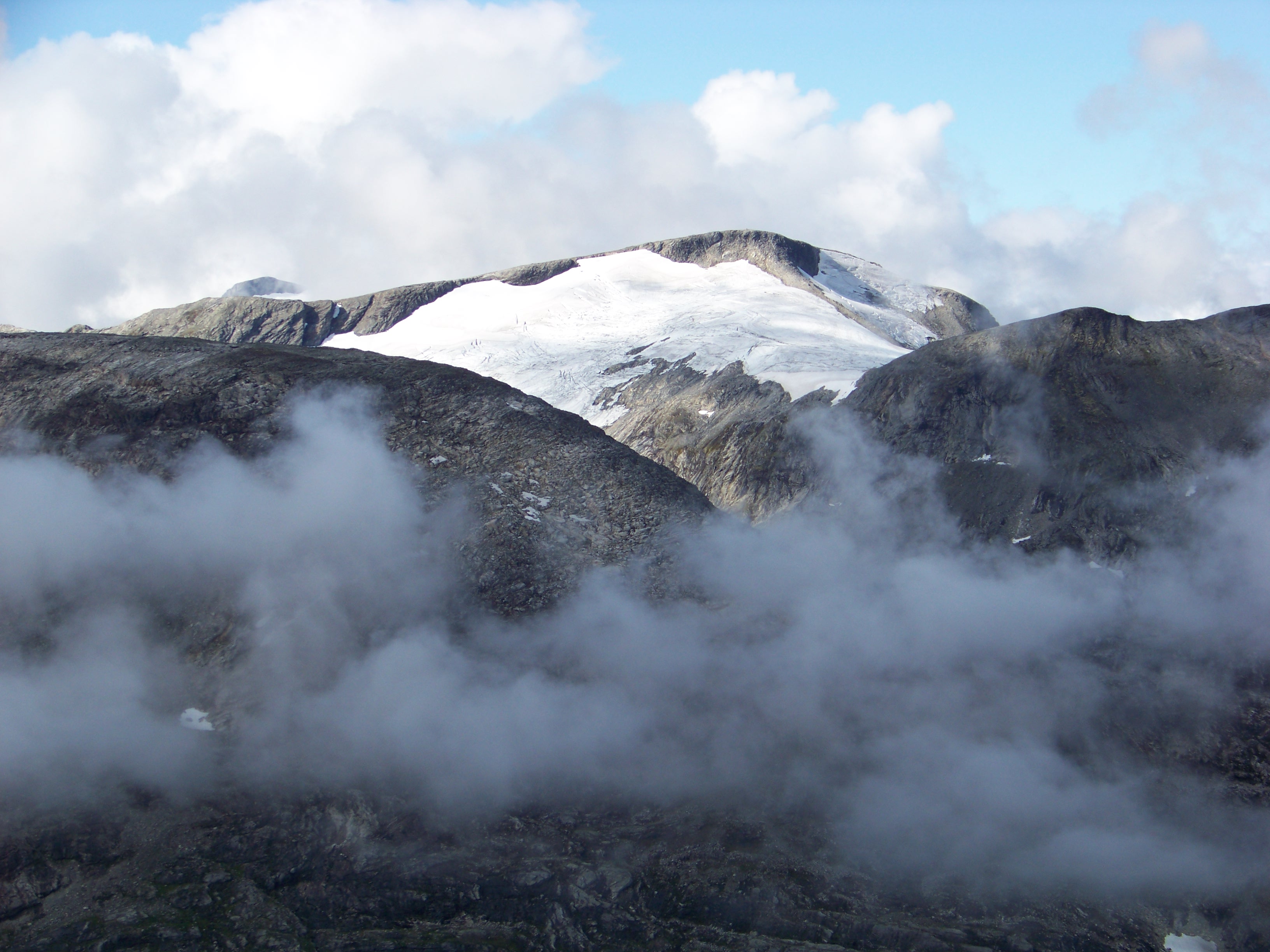 Winding our way through a series of hairpin bends, we found ourselves climbing well above the surrounding mountains of the fjord. In fact, that large, jagged peak I’d assumed would be our destination next to Geiranger was soon well beneath us. We made a brief stop for photos, looking down at the town and our ship, which now looked like miniature toys scattered in a model landscape. Up we went, higher and higher until we finally hit the snow line.