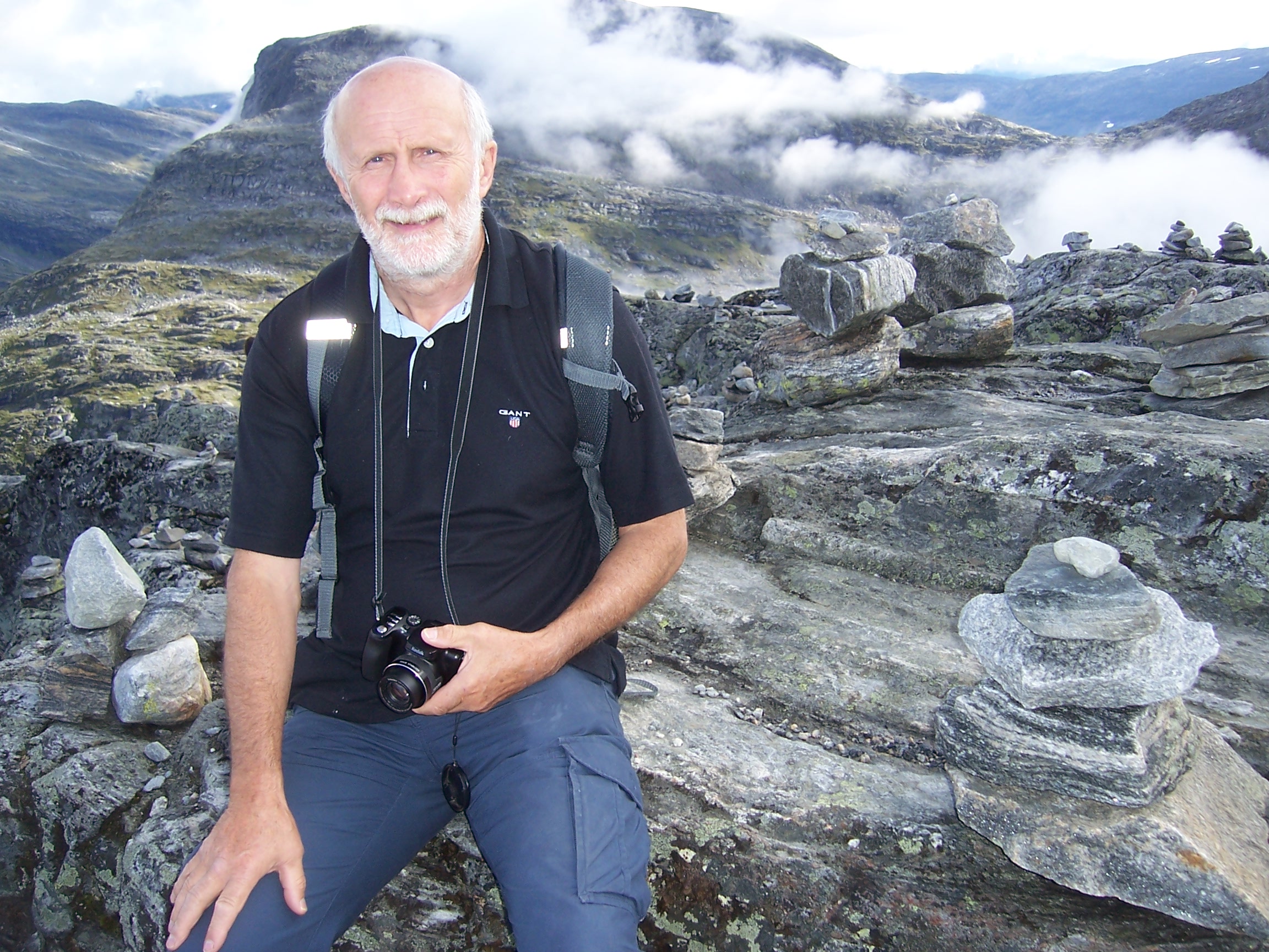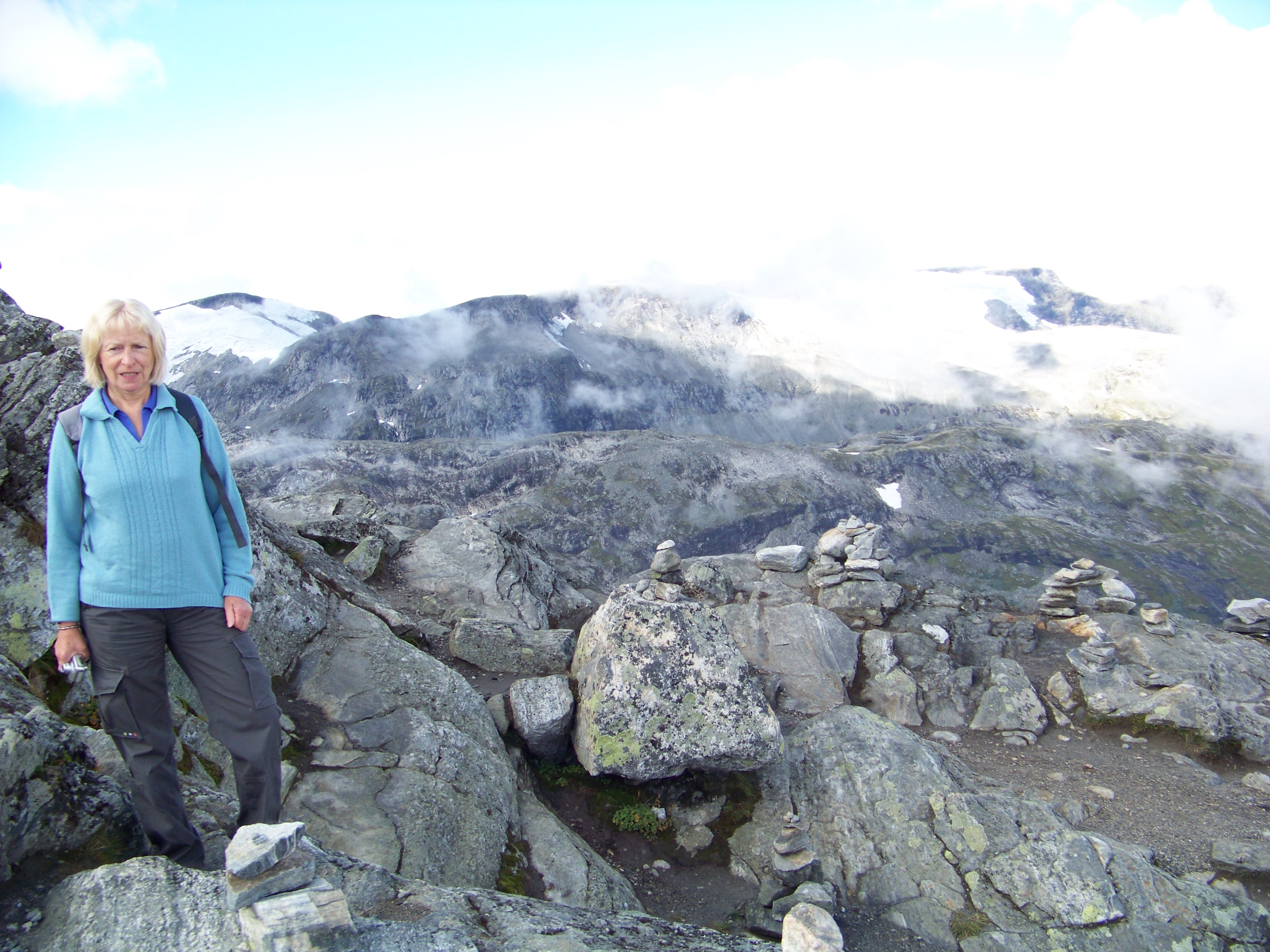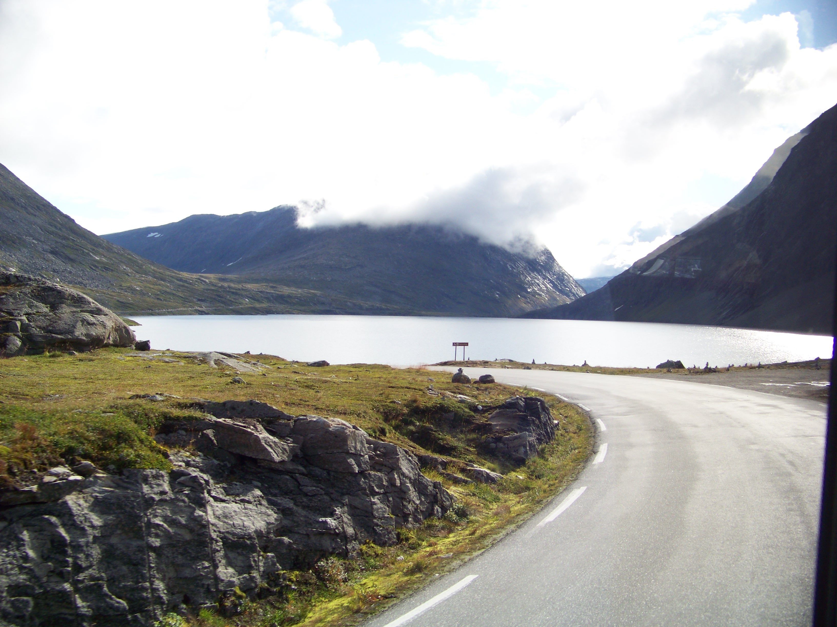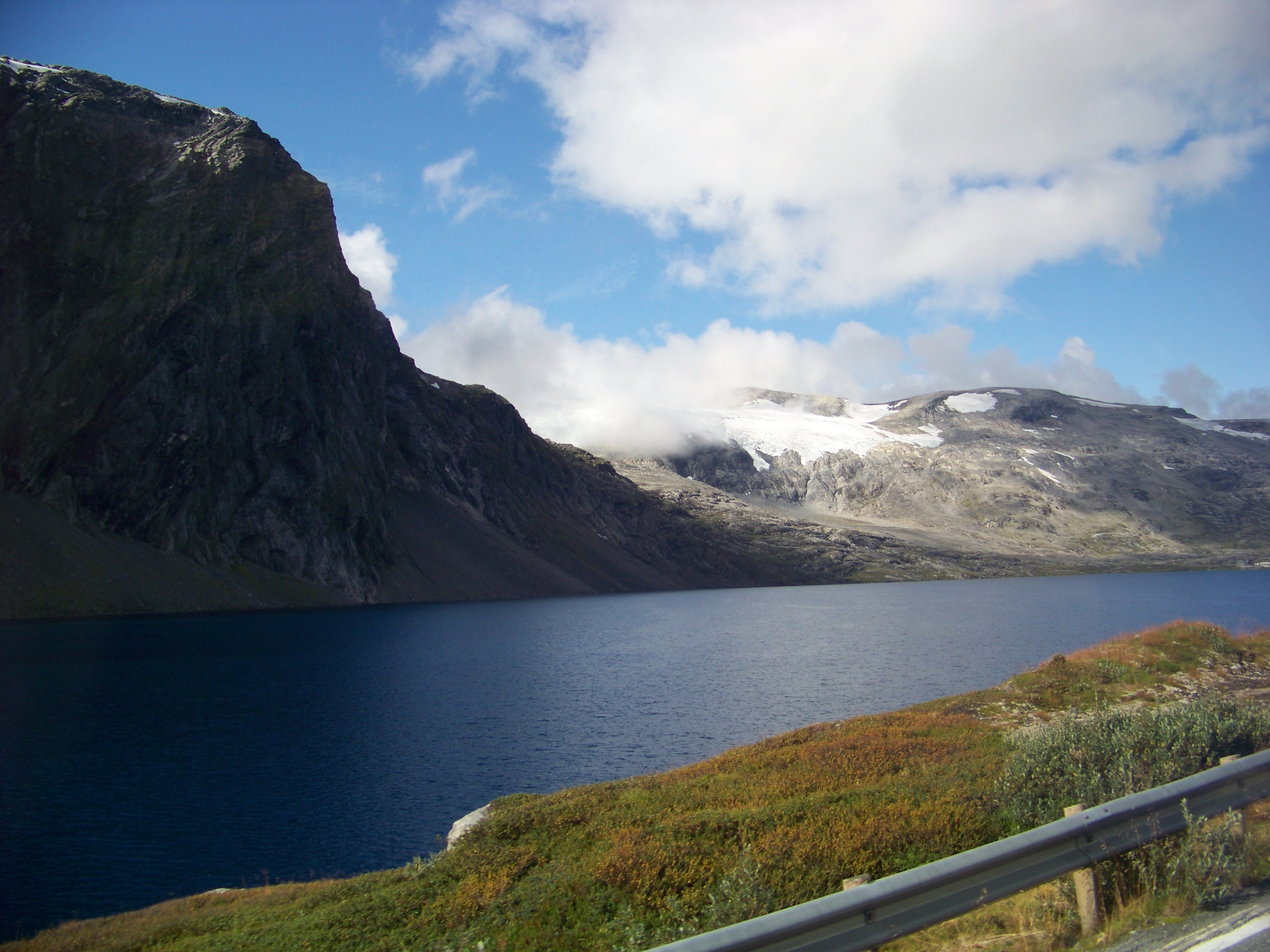 But still, our driver didn’t stop. Instead, he announced that we were in for an “extra treat”, a rendezvous with the Oslo bus. We continued along a flooded cwm cradling a crystal-clear blue lake, apparently 90 metres deep. Eventually, we reached a T-junction and parked. Some ten minutes later, out of a dark tunnel bored into a sheer cliff face, the Oslo bus emerged. Heaven knows how long that tunnel must be, as the mountains above stretched endlessly. The bus didn’t stop, no Oslo passengers today, I suppose!