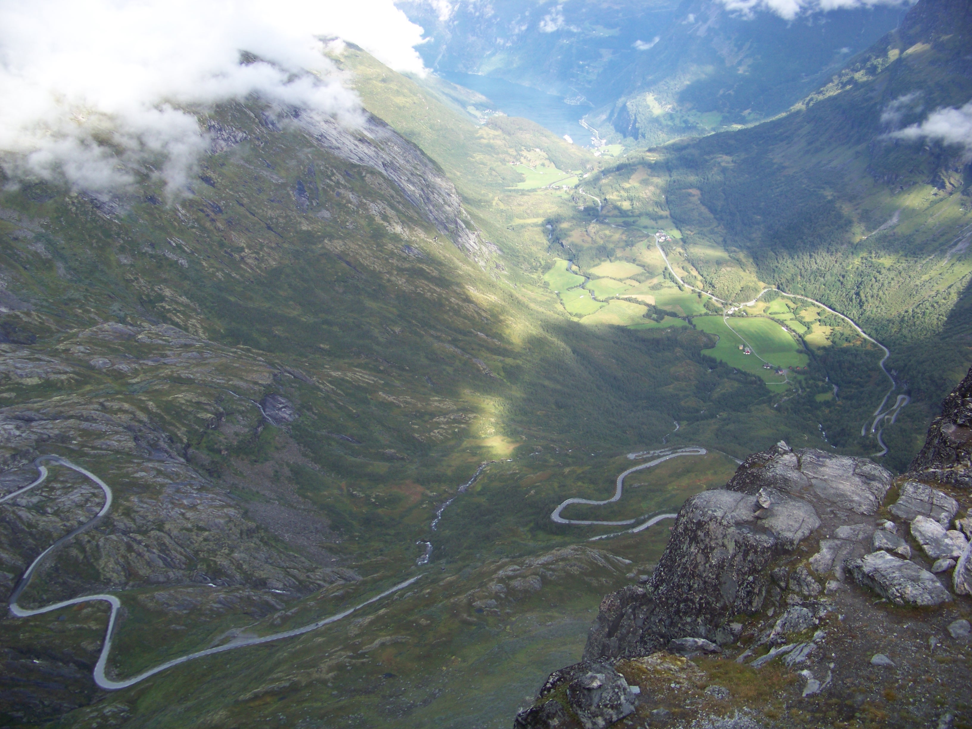 After breakfast, we headed on deck, where we were greeted by the most dramatic fjord yet. The mountains seemed to wrap around the ship, tight and towering. Since it’s a UNESCO World Heritage site, I suppose it had to stand out from the others. And, to be fair, it did. It looked like a fine day ahead, but with the height and proximity of those mountain walls, we could barely see the sky, let alone the weather creeping in behind them.