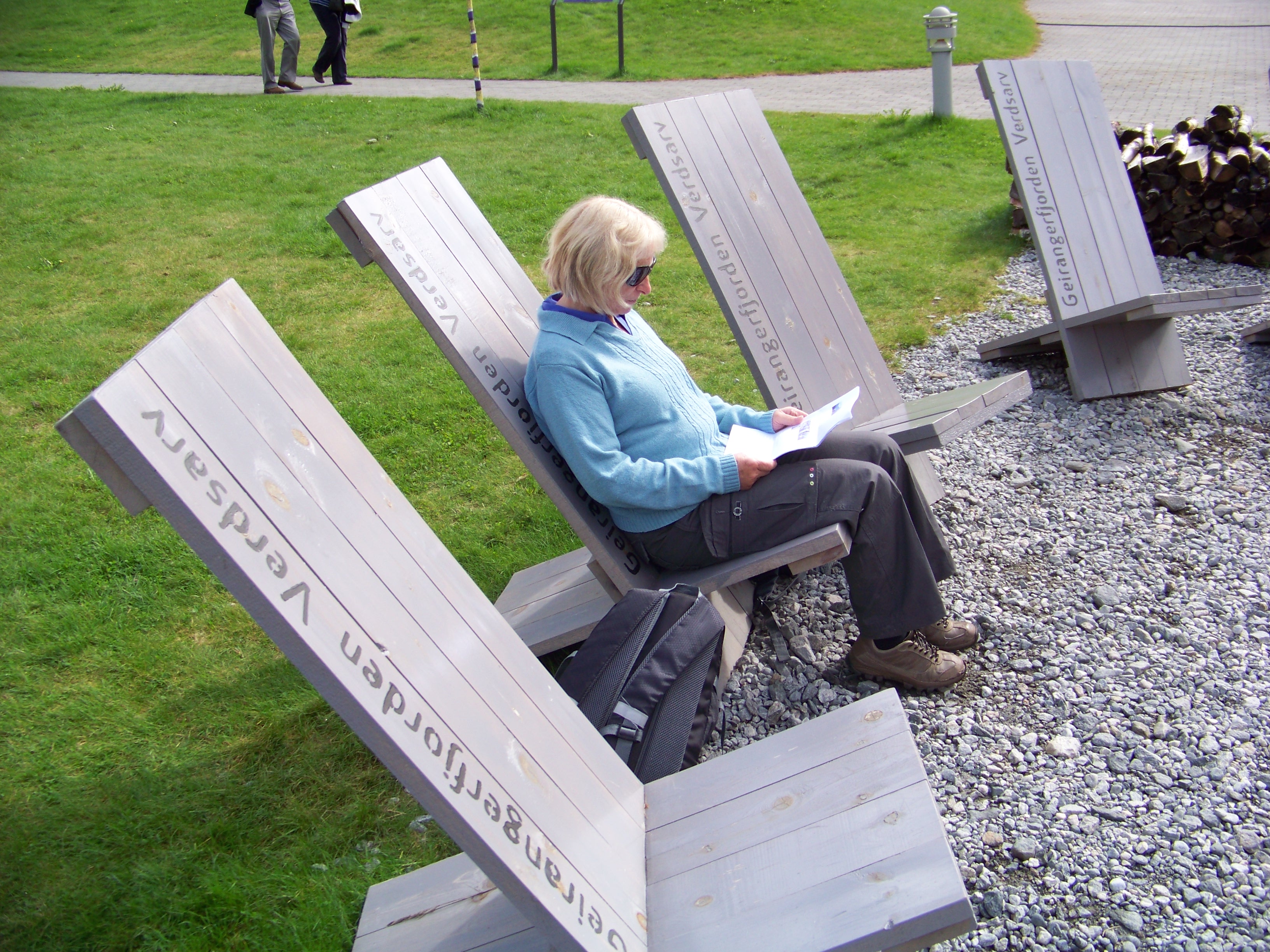 After nearly half an hour at the top, feeling thoroughly chilled despite the bright sunlight, we reboarded the bus for the ride back down. With no additional stops for non-existent Oslo passengers, we were soon back in Geiranger. We hopped off at the hotel above town and ambled over a charming bridge and path to the museum. After several photo stops, we began our descent along a metal walkway, tracing a gushing, frothing stream as it cascaded from the mountain heights above, crashing its way down until it met the tranquil fjord below. Along the way, we bumped into Rob and Jan, who were heading up, but we kept the chat brief; the waterfall spray had us steadily soaked by then!