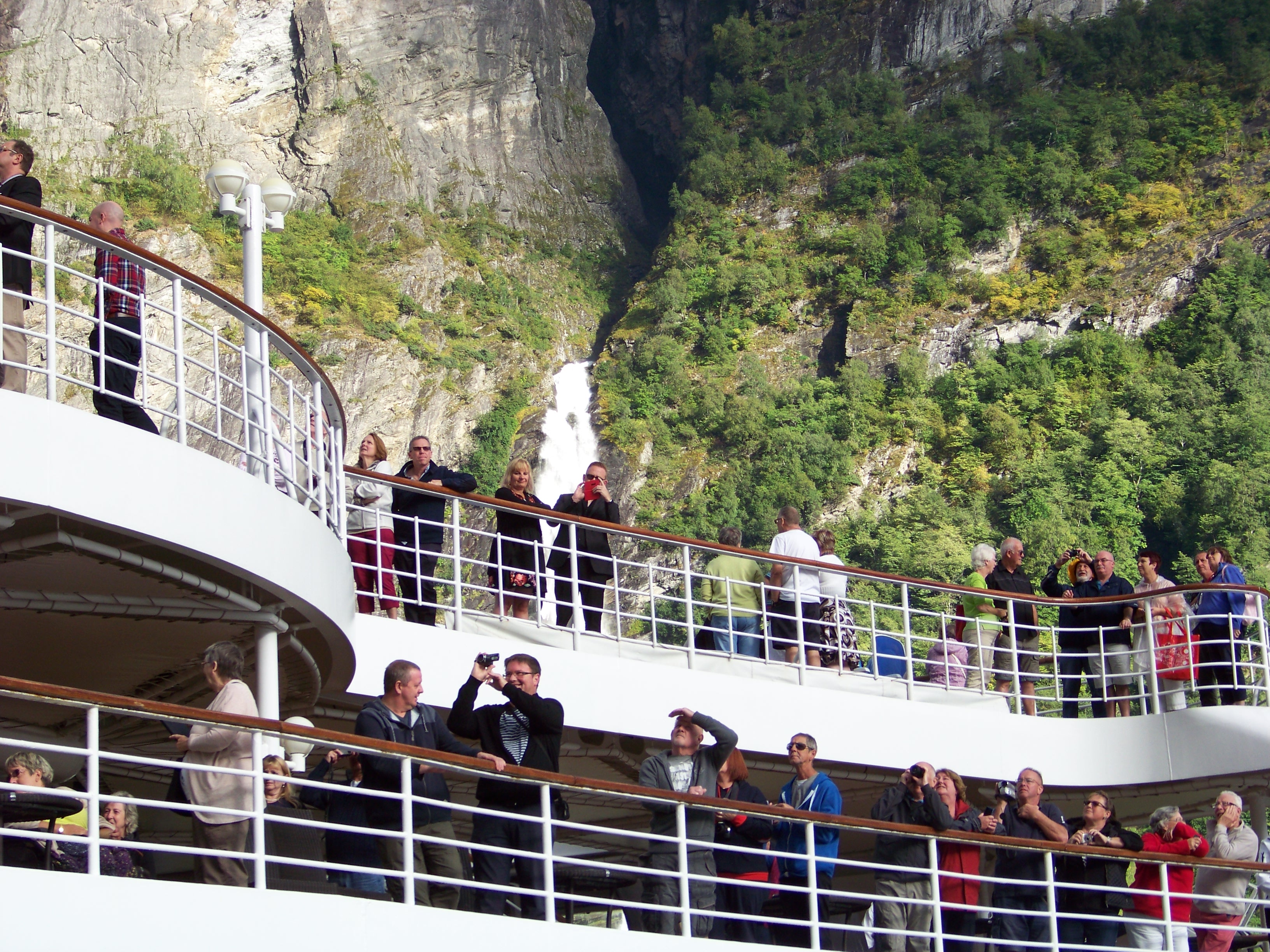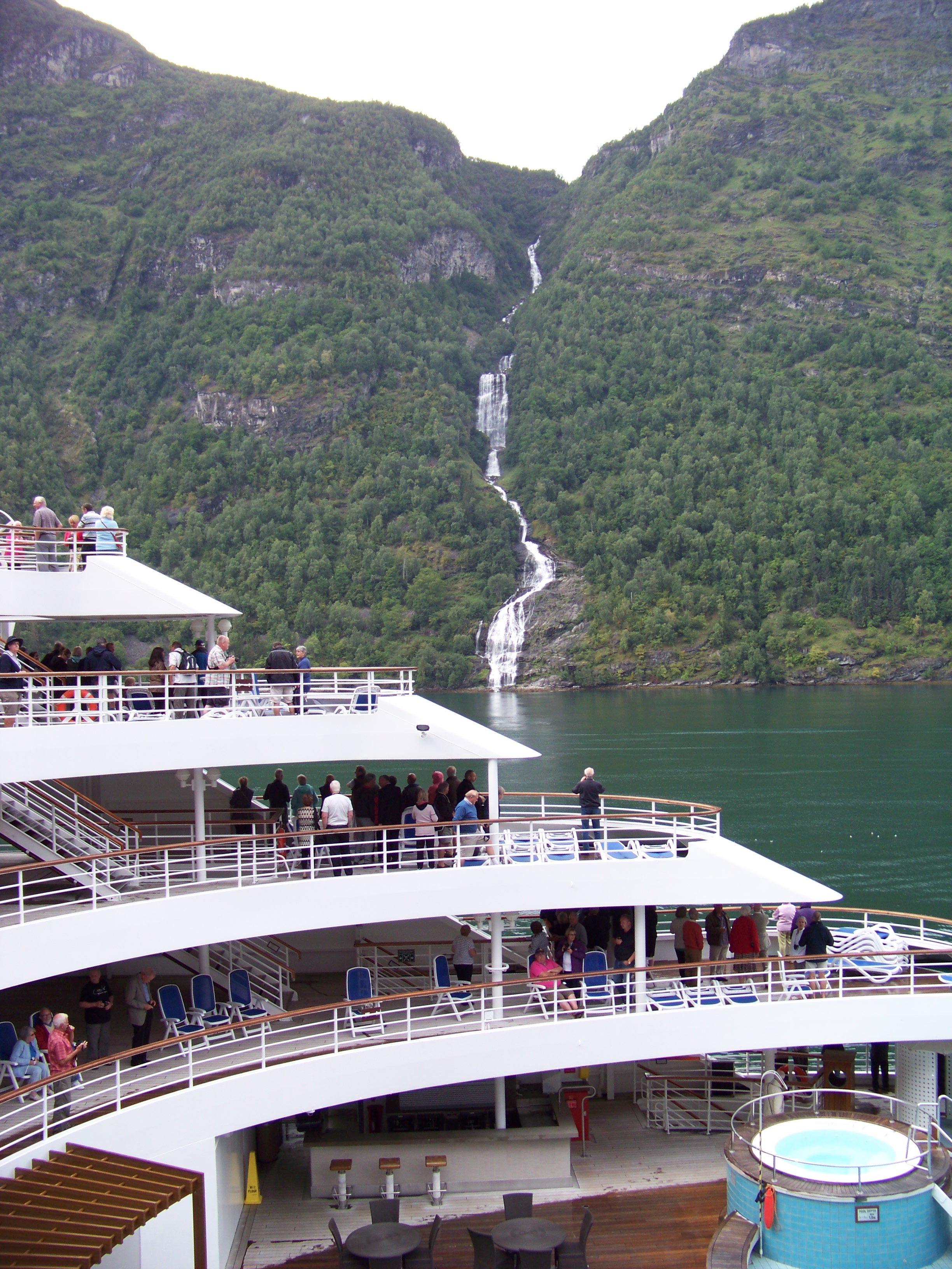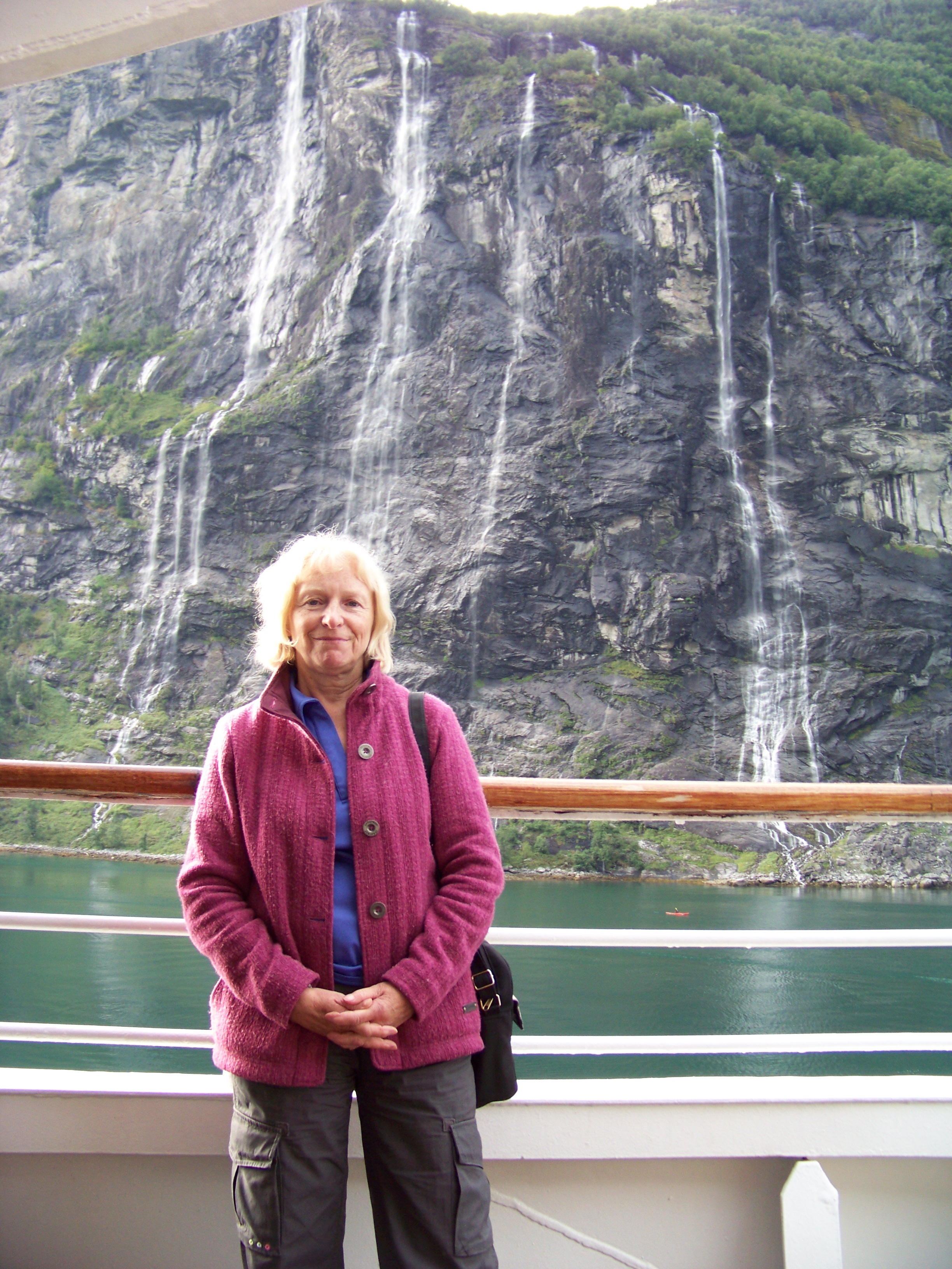 Later, Sue headed to the stern to soak up the sail-away music and lingered to watch the breathtaking scenery slip by. Over the intercom, the captain announced a unique manoeuvre: as we approached the famous Seven Sisters waterfalls, he planned to stop the ship in the fjord, rotate it a full 360 degrees, giving everyone a prime view of both the Sisters and the towering waterfall on the opposite shore. Even better, a rescue craft would be launched to film the spectacle, a first for the Oriana!