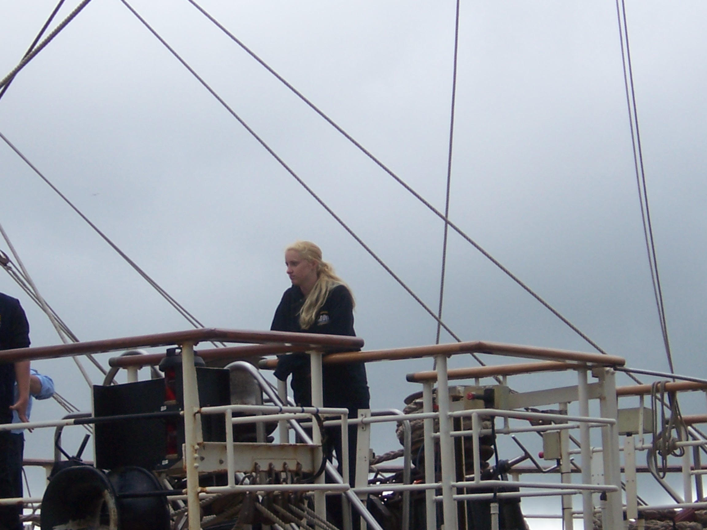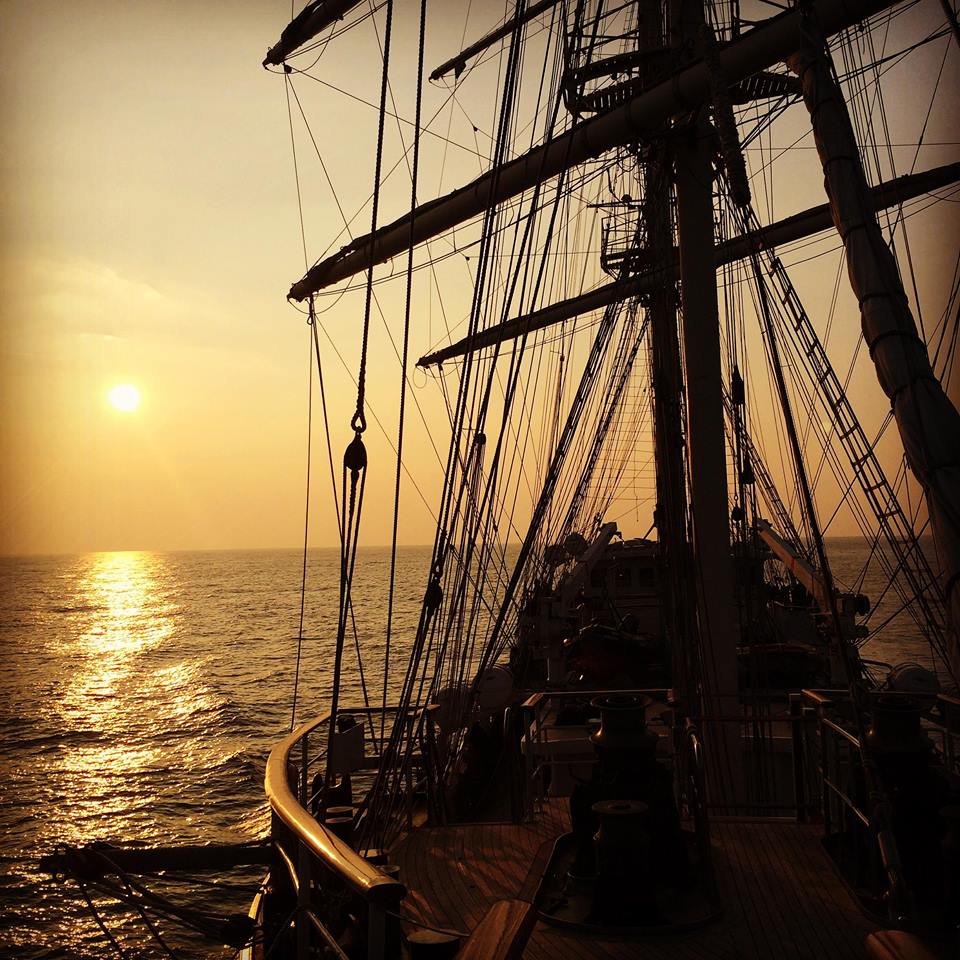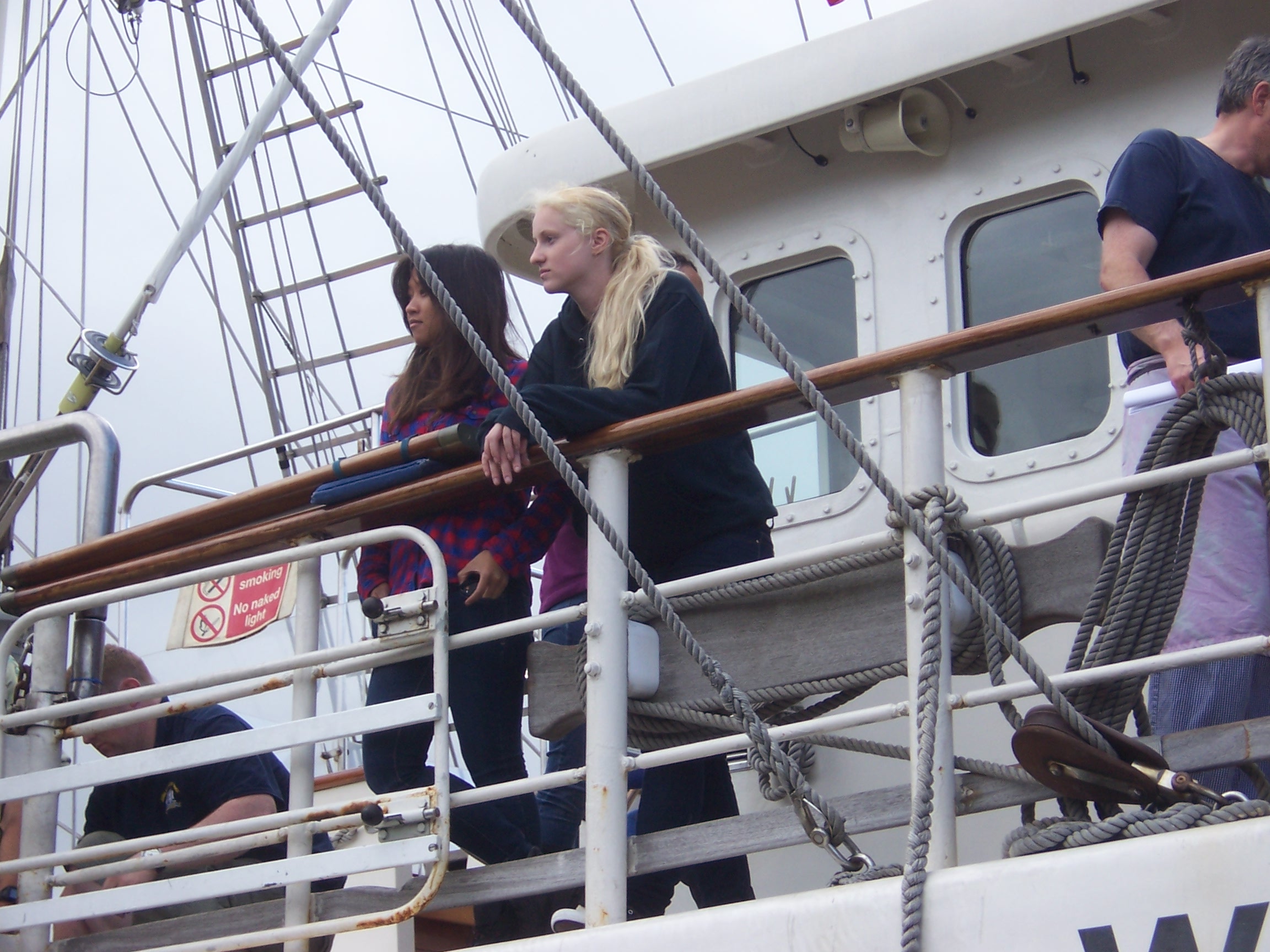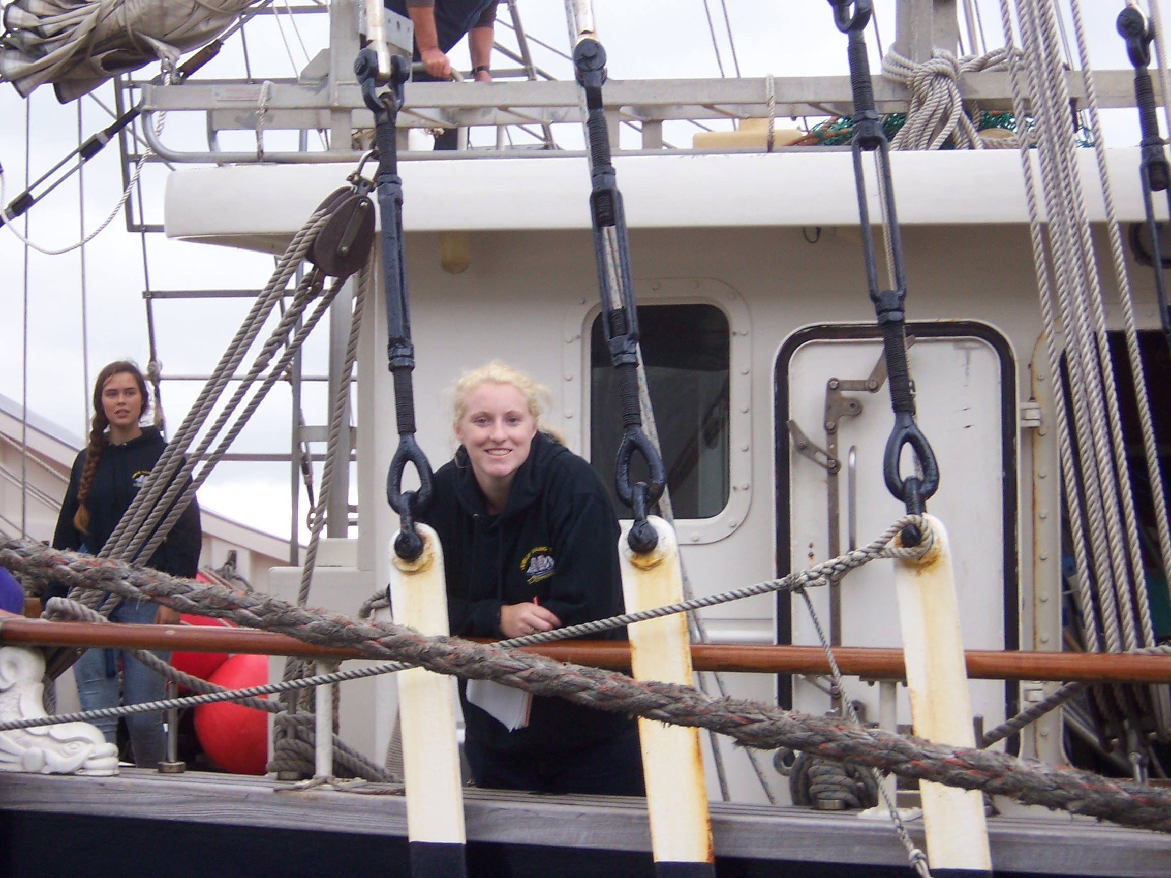 Unfortunately, we learned later; that the Tenacious’s journey down the Thames didn’t go smoothly. A fishing net got caught around one of her propellers, and they had to stop near Gravesend. A diver was called in to free the propeller the next day. After sailing in the English Channel and along the southern coast, Sarah reported that crewing the ship was tough but exhilarating. She saw the sun set and rise during her watches, climbed the mast, unfurled and took in the sails, helped in the galley, took the helm, and I imagine she probably swabbed the decks as well, though that wasn’t mentioned. She made lots of new friends, including the creator of ‘Bagpuss’, who generously treated their ‘watch’ to a slap-up meal in Dieppe.