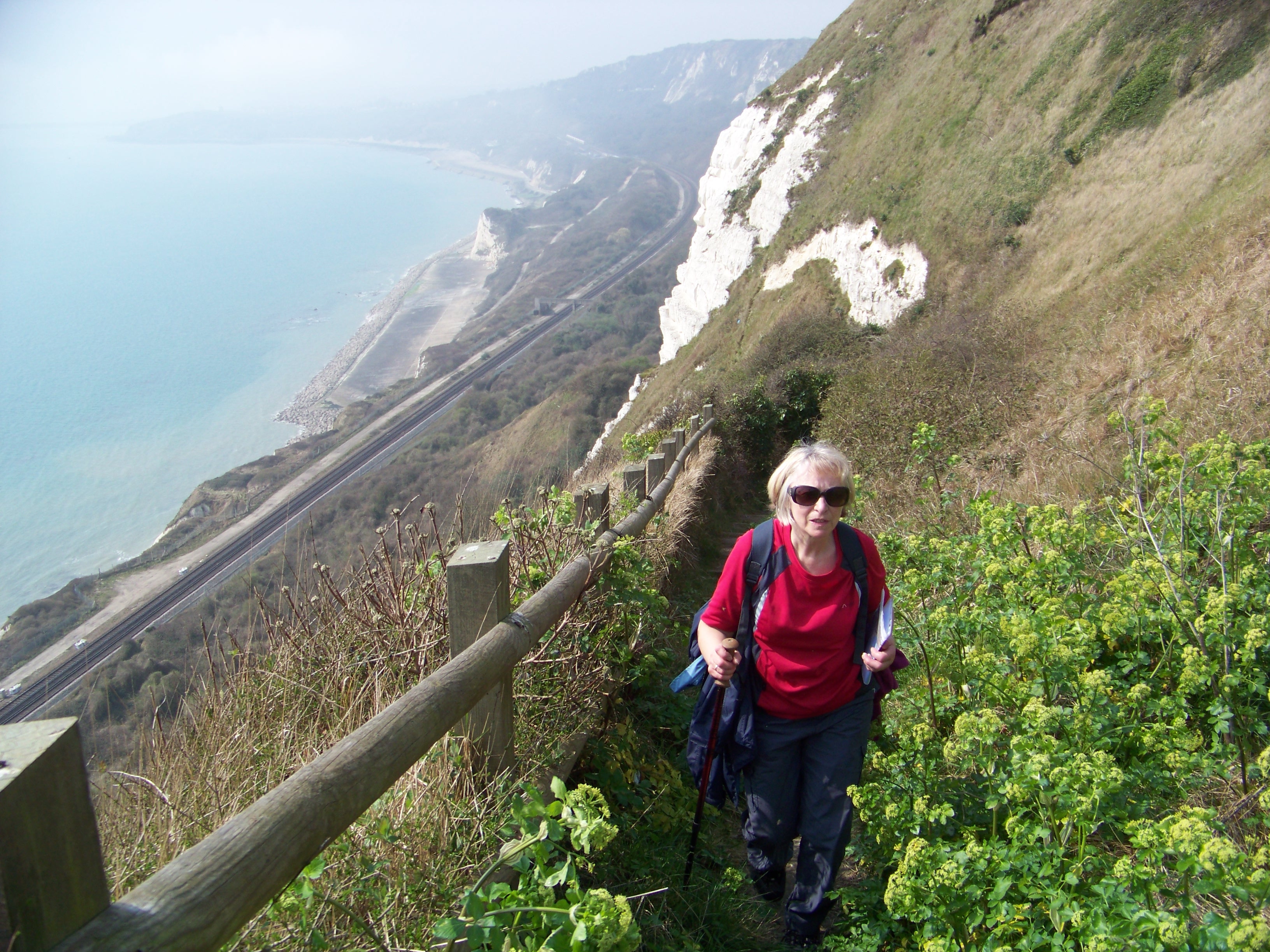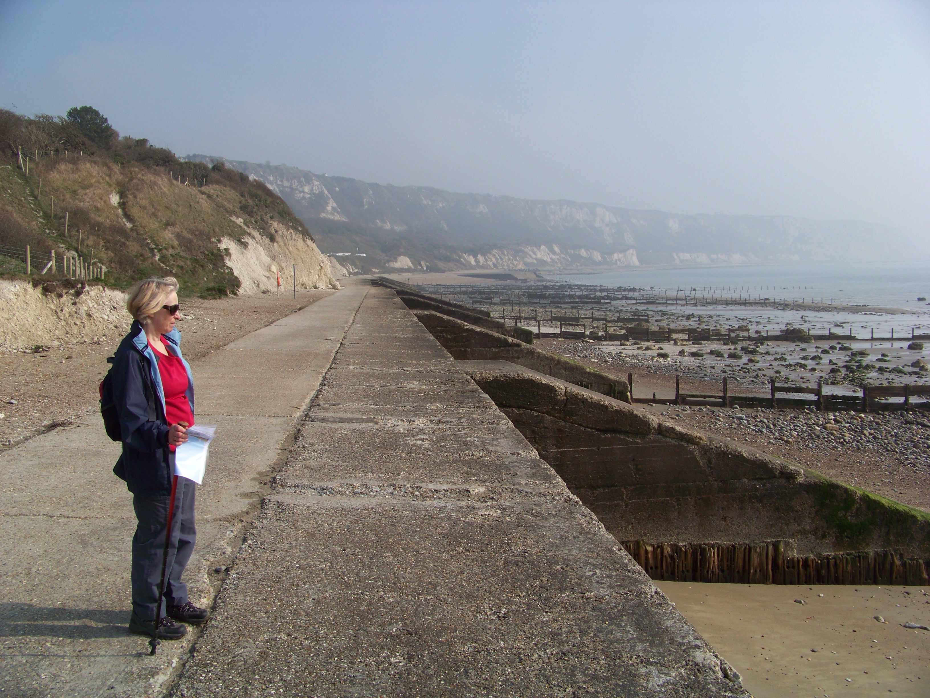 The next morning, after breakfast, I powered up the GPS, and we made our way purposefully down to the beach. The plan was to walk from Folkestone to Dover along the white cliffs, a lovely sunny morning, perfect for a jaunt. We strolled along the base of the cliffs, mostly on a deserted concrete walkway. After a couple of miles, we passed a few other walkers, who, a little further on, took a different path that led up the cliffs to the one I had plotted. We carried on, following the path we’d picked out to ascend the chalky heights.
