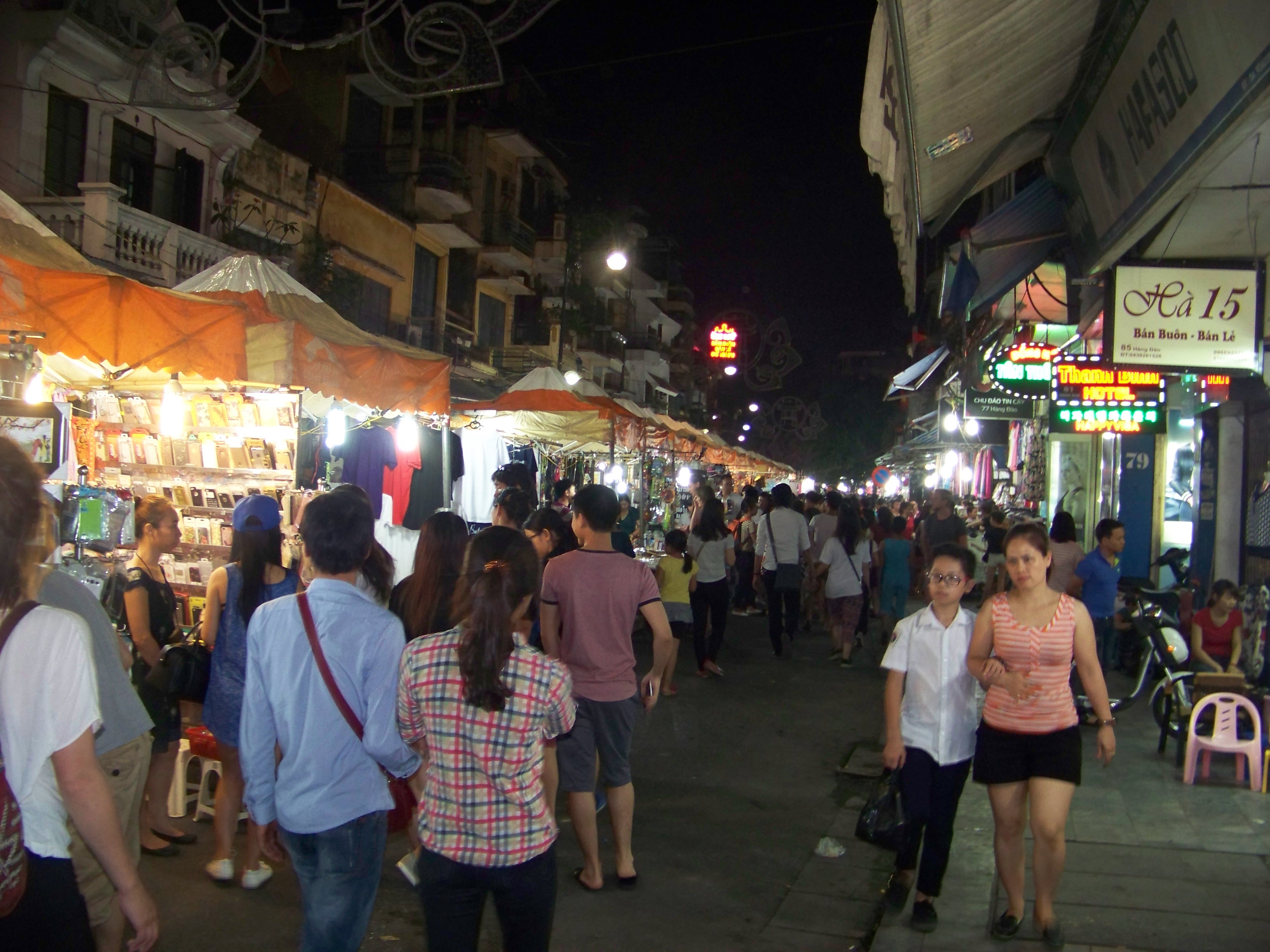 We found a restaurant on Hang Dao Road, which also hosts the city’s night market on weekends. We were the only ones dining, but it was still early by local standards. Sue ordered chicken, while I opted for catfish; both dishes hit the spot. After dinner, we set out to explore the market. We planned to walk down one side of the street, reach the end, and return along the other. However, we hadn’t quite anticipated how long this road would be.