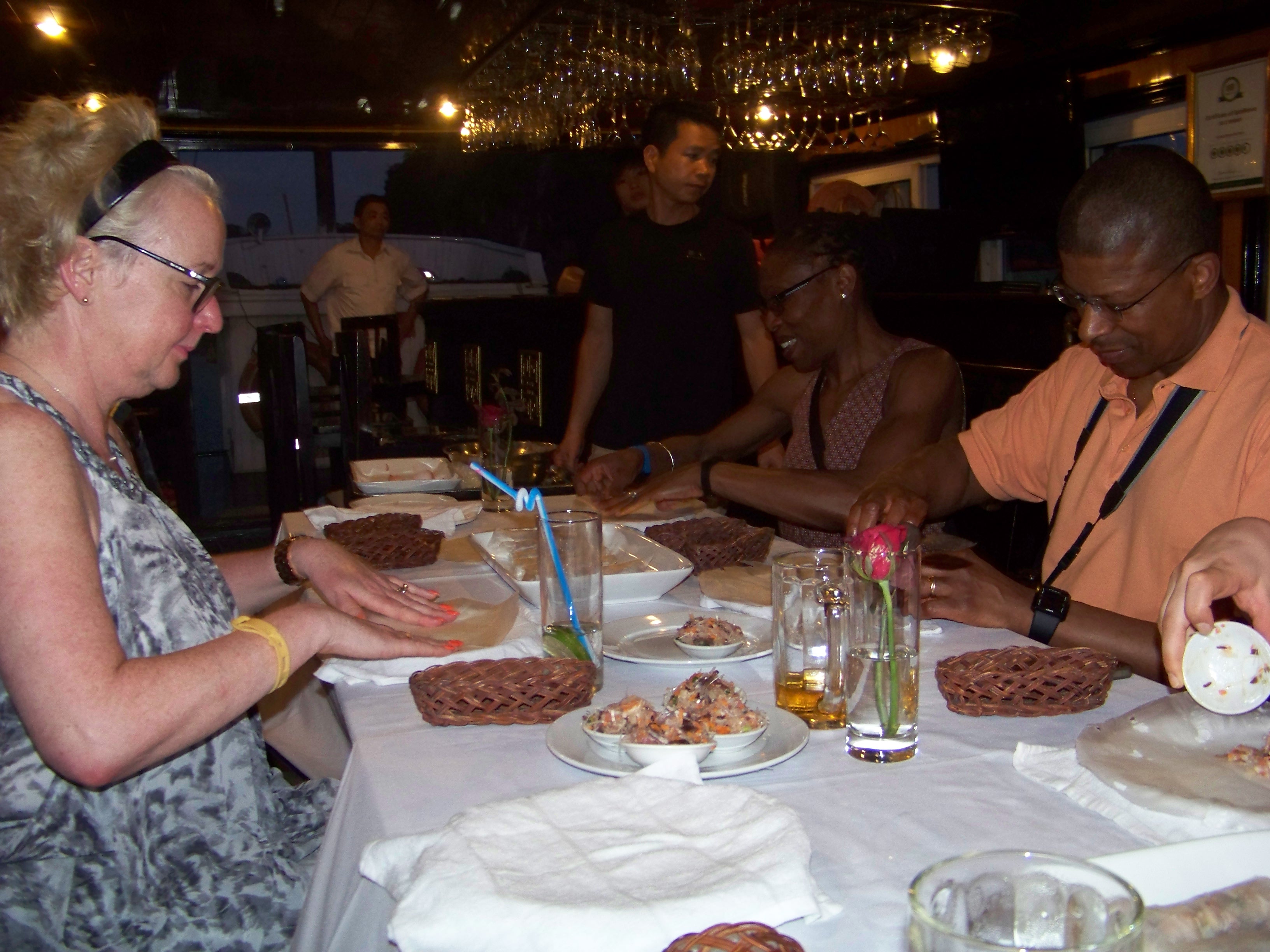 Later, we returned to the main room where the chef gave us a hands-on demonstration on how to make traditional Vietnamese Spring Rolls. The ingredients had already been prepared, so it wasn’t too complicated to make them; it was certainly novel. Once we’d rolled them up, they were whisked away to be cooked, ready to be served as part of our evening meal.