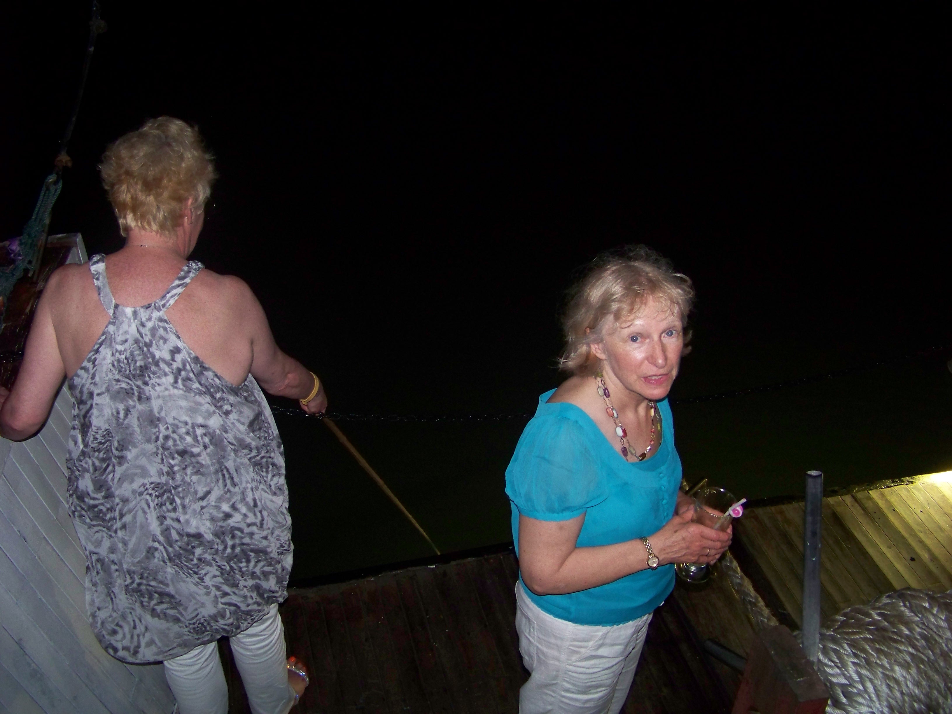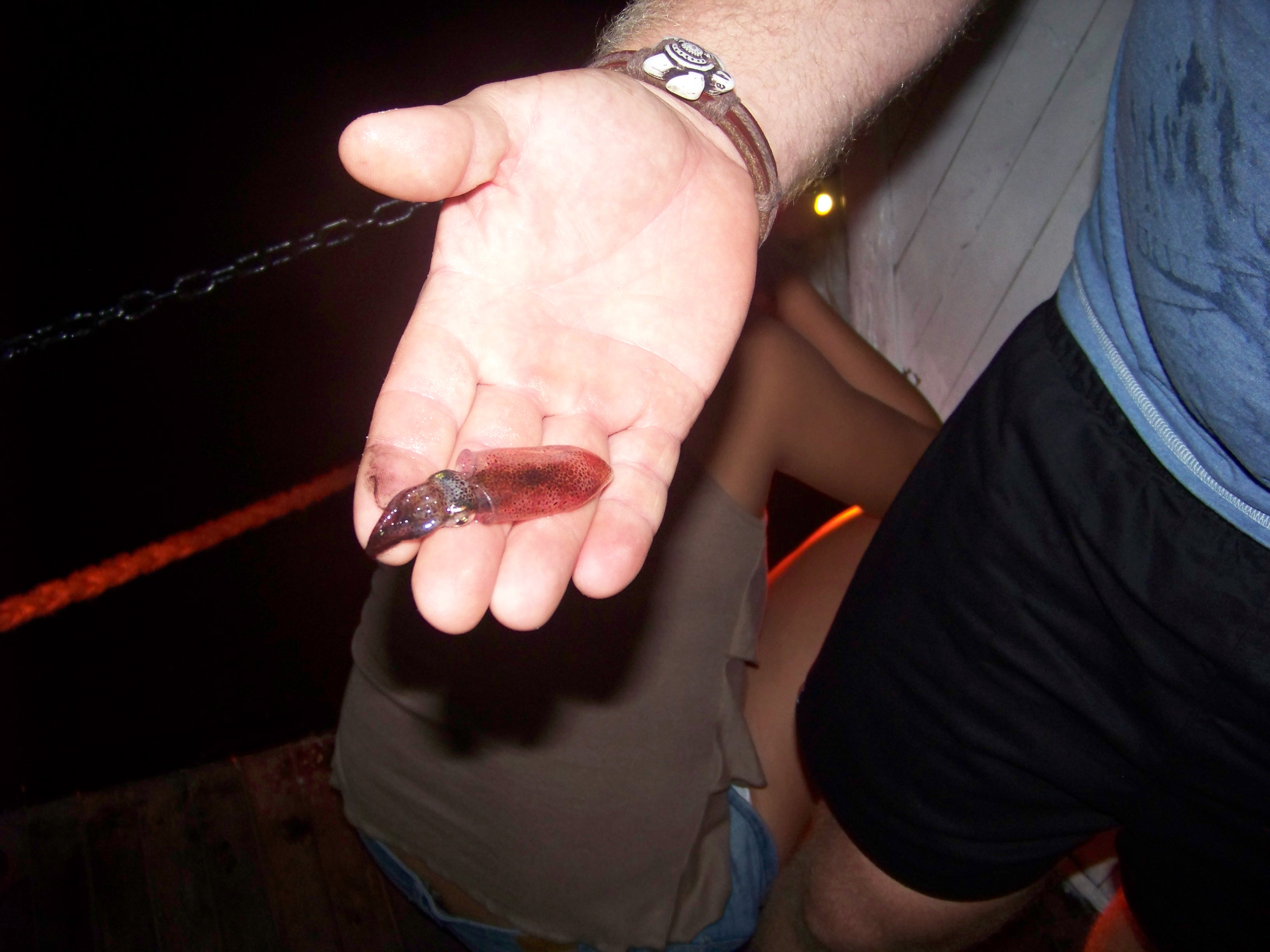 The group spent the rest of the night trying to catch squid off the front of the boat. First, the men tried and failed dismally, then the women took over, and things got quite a bit silly when they hooked one squid, two small fish, and a jellyfish, though the latter was caught in a net, not on a line. Sue was determined to stick with the traditional line method longer than anyone else, so I joined her, favouring a harpoon, though that didn’t yield any success either. Still, it was all in good fun, and no one ended up in the water. We finished the evening back at the bar, enjoying the last of the drinks before heading to bed for the night.