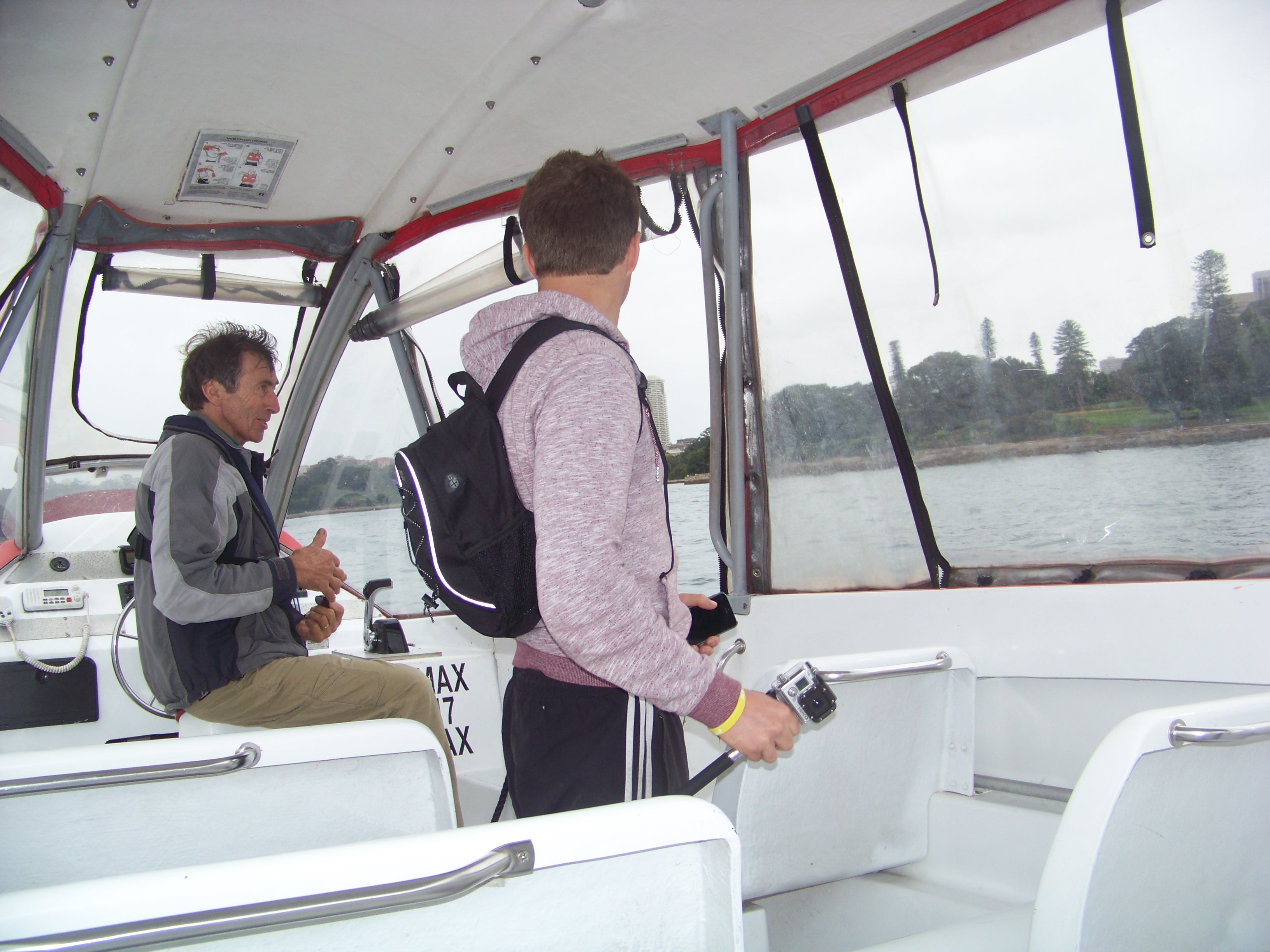 Next, we booked a water taxi to explore the harbour. As we boarded, it started to drizzle, but fortunately, the rain stopped just as our trip began. The taxi took us around the Opera House, over to the Botanical Gardens, past the old fort set on a small island (now converted into a restaurant), and then by the Prime Minister’s summer residence. We passed under the Harbour Bridge, all while tourist helicopters buzzed continuously overhead. (Perhaps that’s something to try next time!)