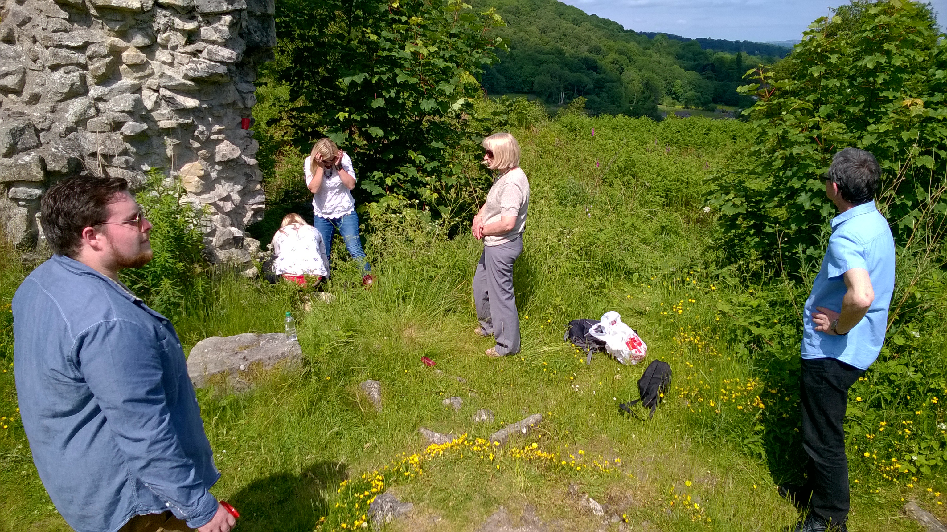 Doreen and Josie stayed behind and sat on Nan’s bench while the Harborough contingent, along with David Prydderch, climbed the hill once more, this time with Nan. In the centre of the ruins, we divided her ashes equally into small containers, including portions for Lucas and Ellis, leaving a little for the honeysuckle. Each of us, in turn, scattered the remains. We then chose a spot next to one of the castle walls, where Charlotte and Sarah planted the honeysuckle along with the rest of the ashes. I think Nan would have loved that.
