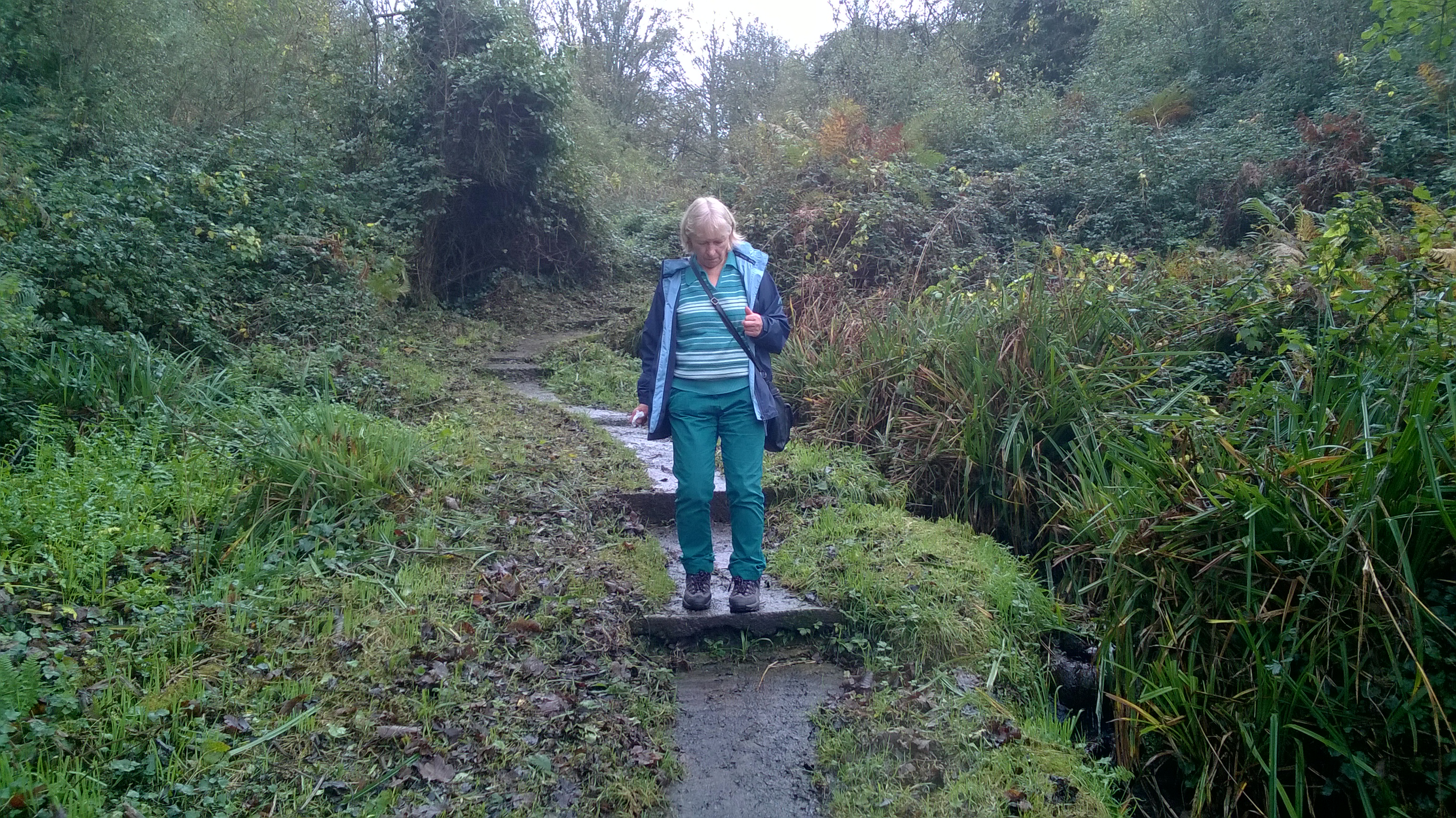 After a rather satisfying breakfast, we laced up our walking boots and set off down the lane we’d attempted the night before. The previous night’s rain had left the air cool and the sky overcast, setting a moody scene for our morning walk. The steep, winding roadway through the wooded valley was slick with wet leaves, making our descent tricky and calling to mind Sue’s misadventure with seagull poo in Southampton.