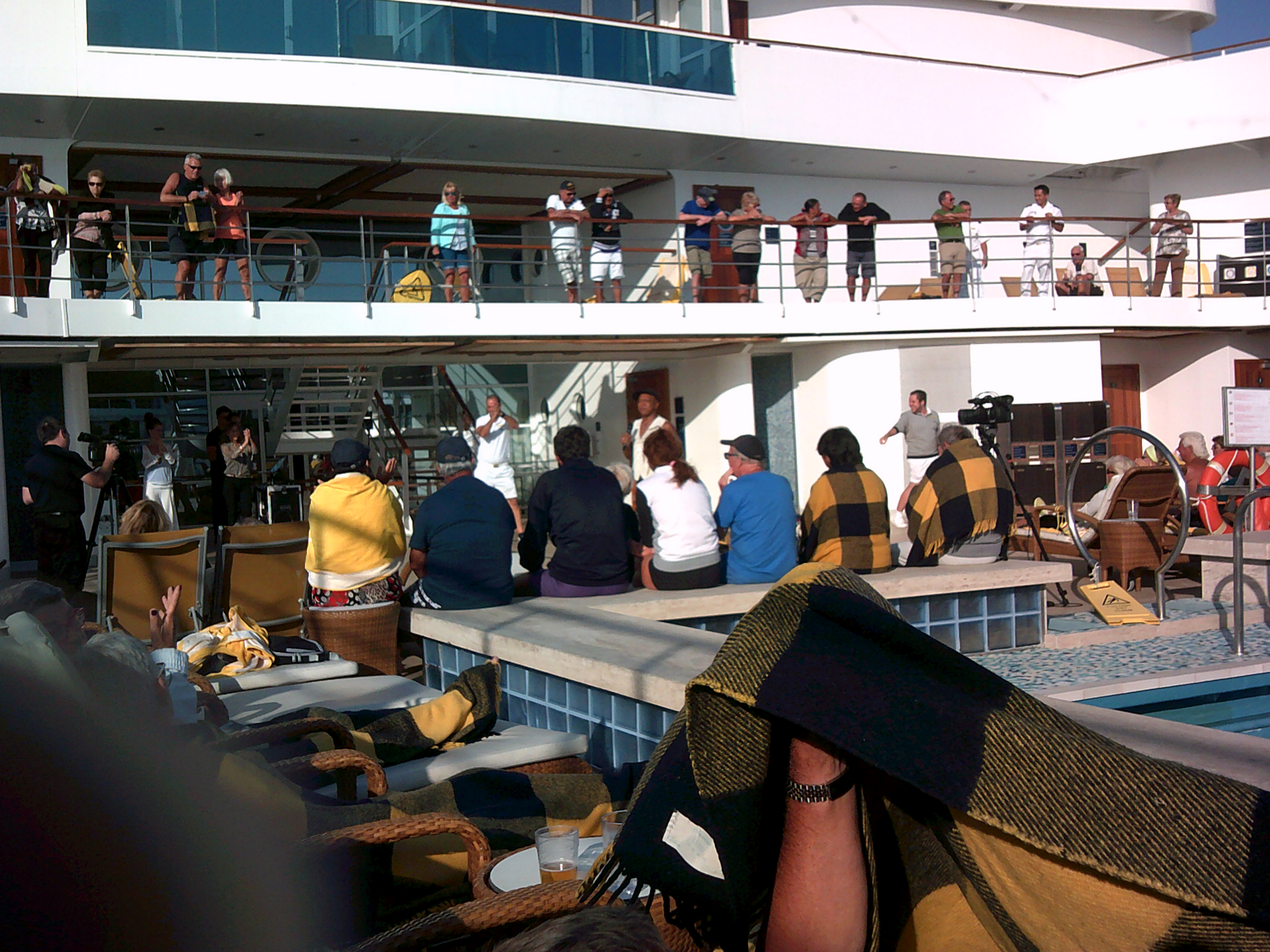Later, I attended a table-napkin folding lecture, picking up a few tricks for Christmas, while Sue enjoyed afternoon tea and continued reading her book. We met up again in the stern lounge for a social gathering arranged for the English on board. Of the 47 Brits, only 13 of us turned up: one Danish, another Australian, and two Scots. There was a fashion show happening at the same time, which may have been more appealing to the others (though we’ll never know). We had a chat among ourselves before taking part in a quiz hosted by Jessica, our English rep. We came second and won a ‘Costa’ cap, although we should have tied for first. Unfortunately, we misspelt the Captain’s name, and so did the winning team, but they still got a point. Foul play was suspected!