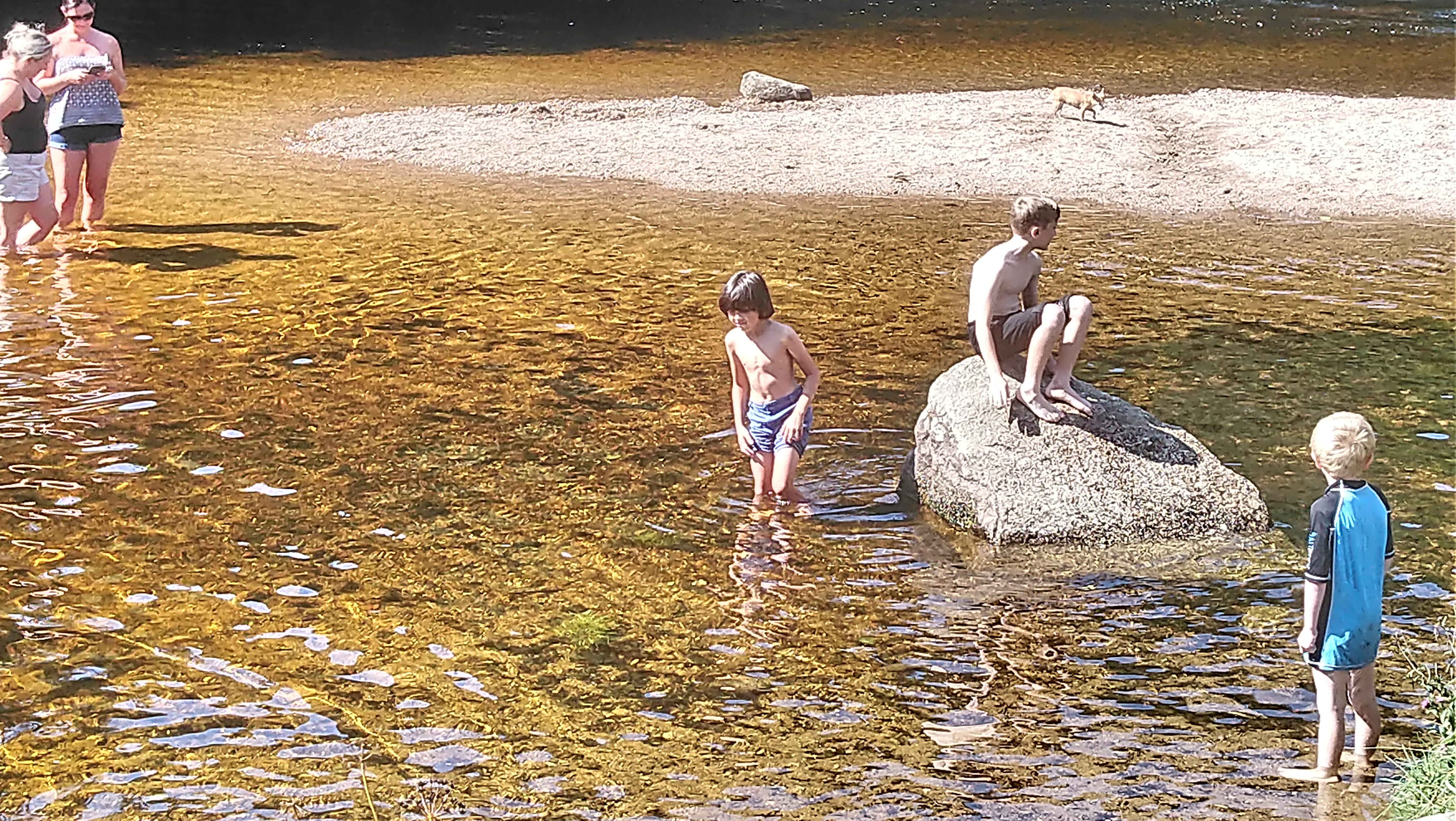 Further along, we came across yet another picture-perfect bridge, this one overlooking enticing water that gurgled and splashed into deeper pools. Perched somewhat precariously on the steeply sloping bank in our fold-up chairs (all the flat spots having long since been claimed by those who had clearly set up camp for the day), we watched the boys take to the water, Ellis bravely stripping down to his underwear before plunging in.