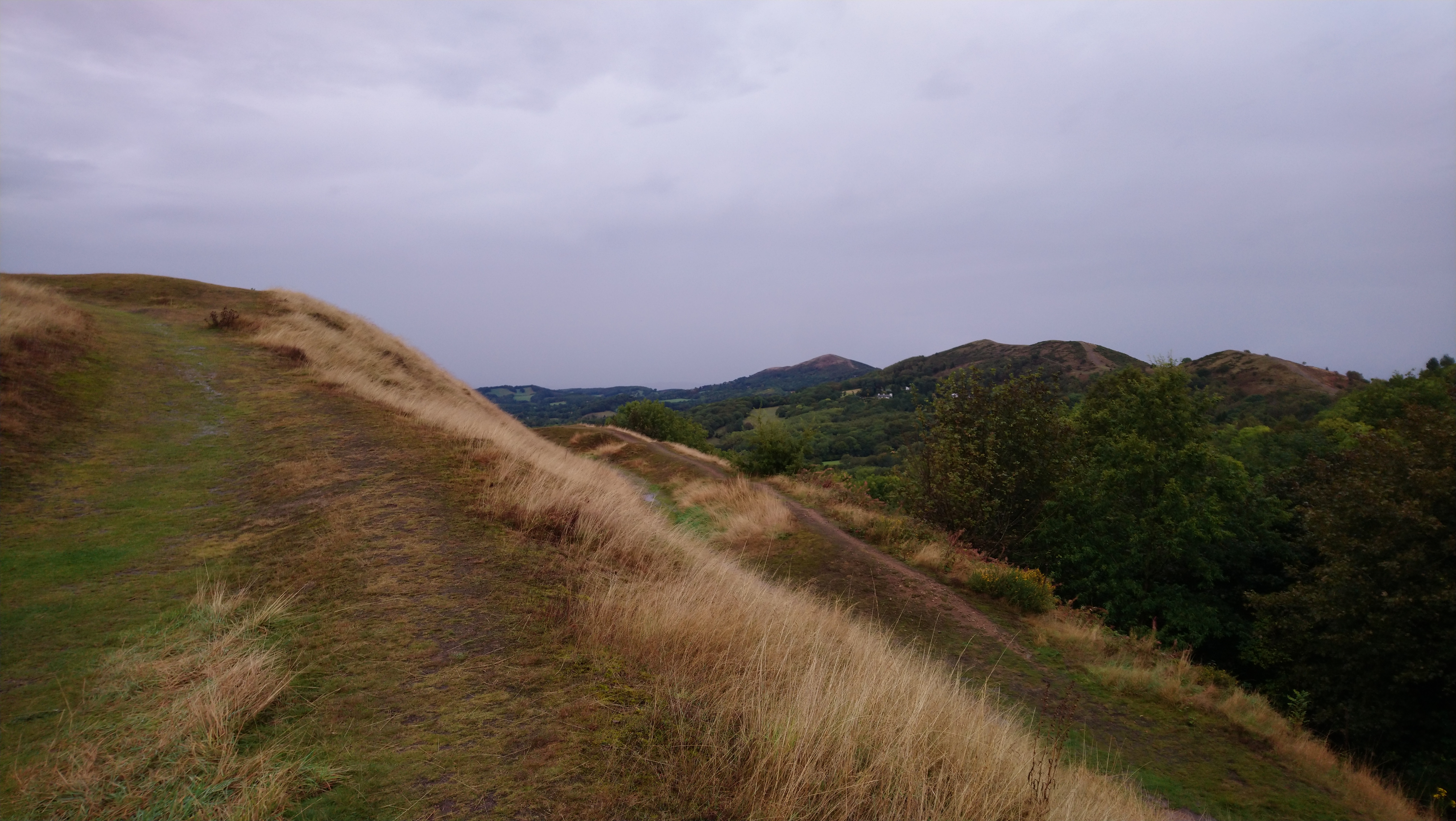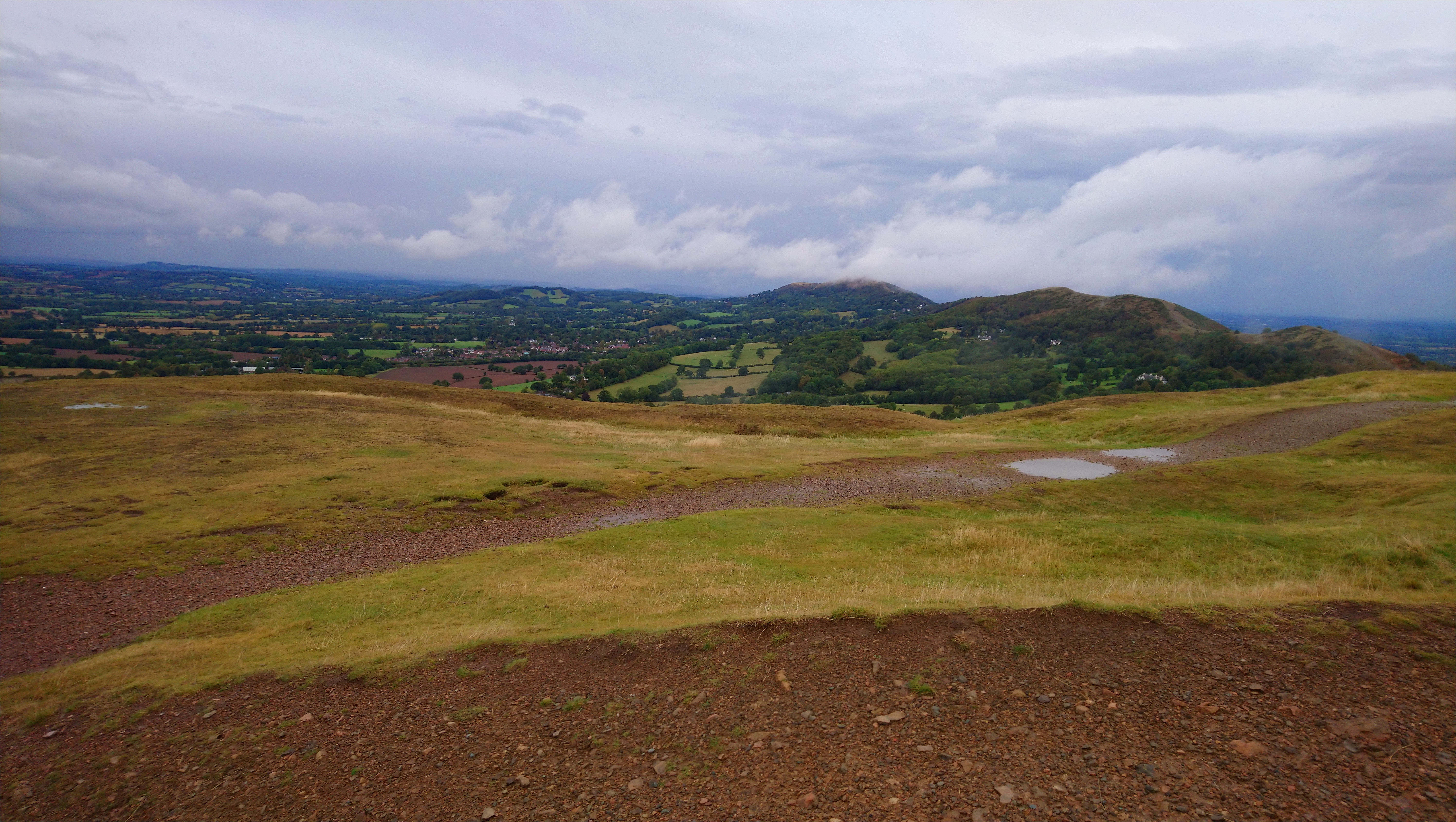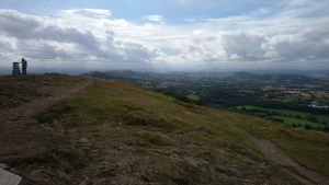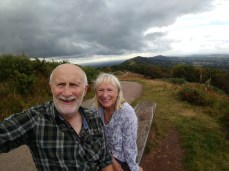 We encountered a few other Monday walkers, though I suspect the BBC’s dire forecast had deterred all but the intrepid (or foolhardy). The early autumn sunshine, tempered by a pleasant cooling breeze, kept us from overheating on the steeper sections. The air was exceptionally clear, offering sweeping views, Welsh mountains to the west, Clee Hill to the north, and Bredon Hill to the east.