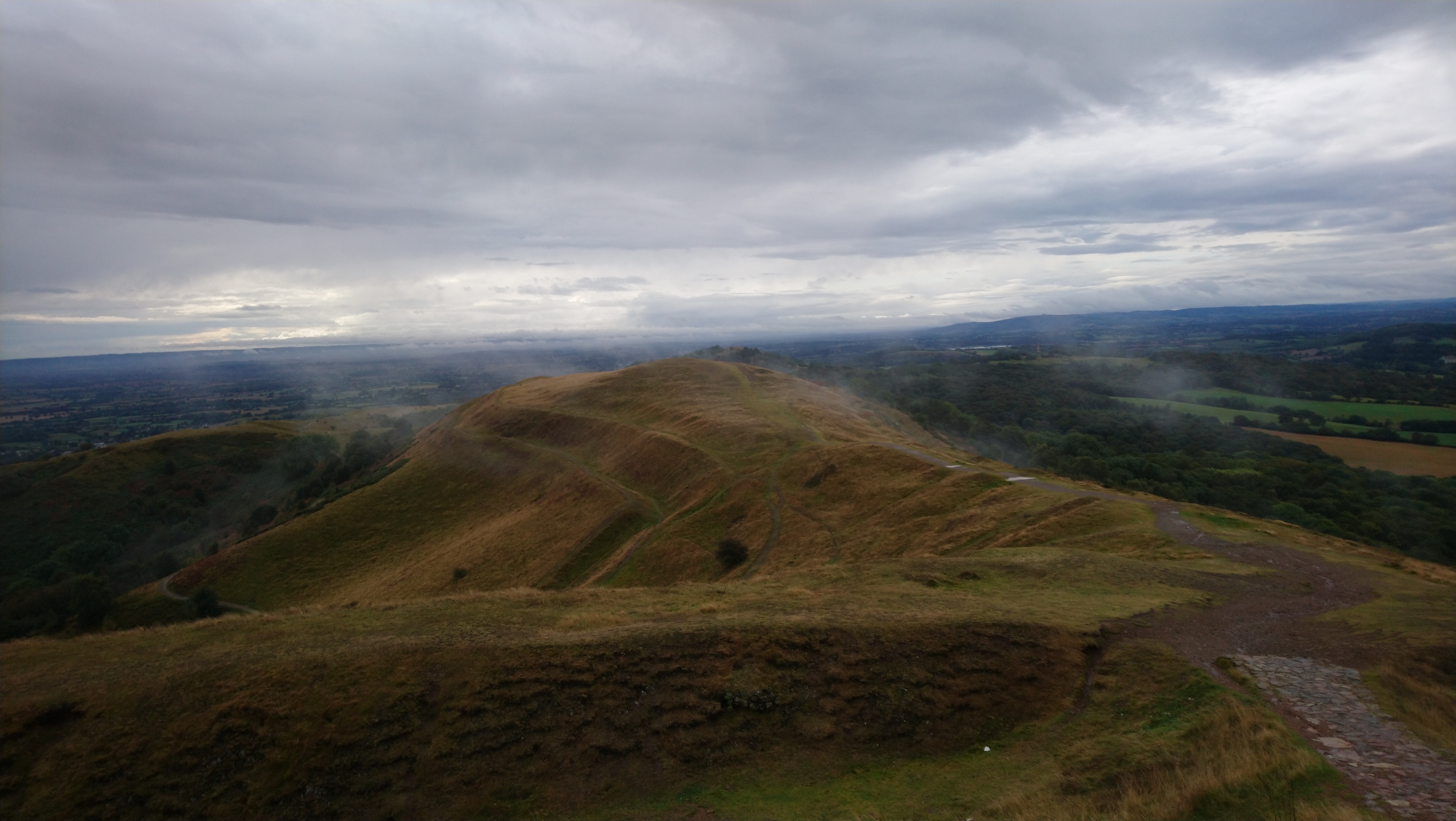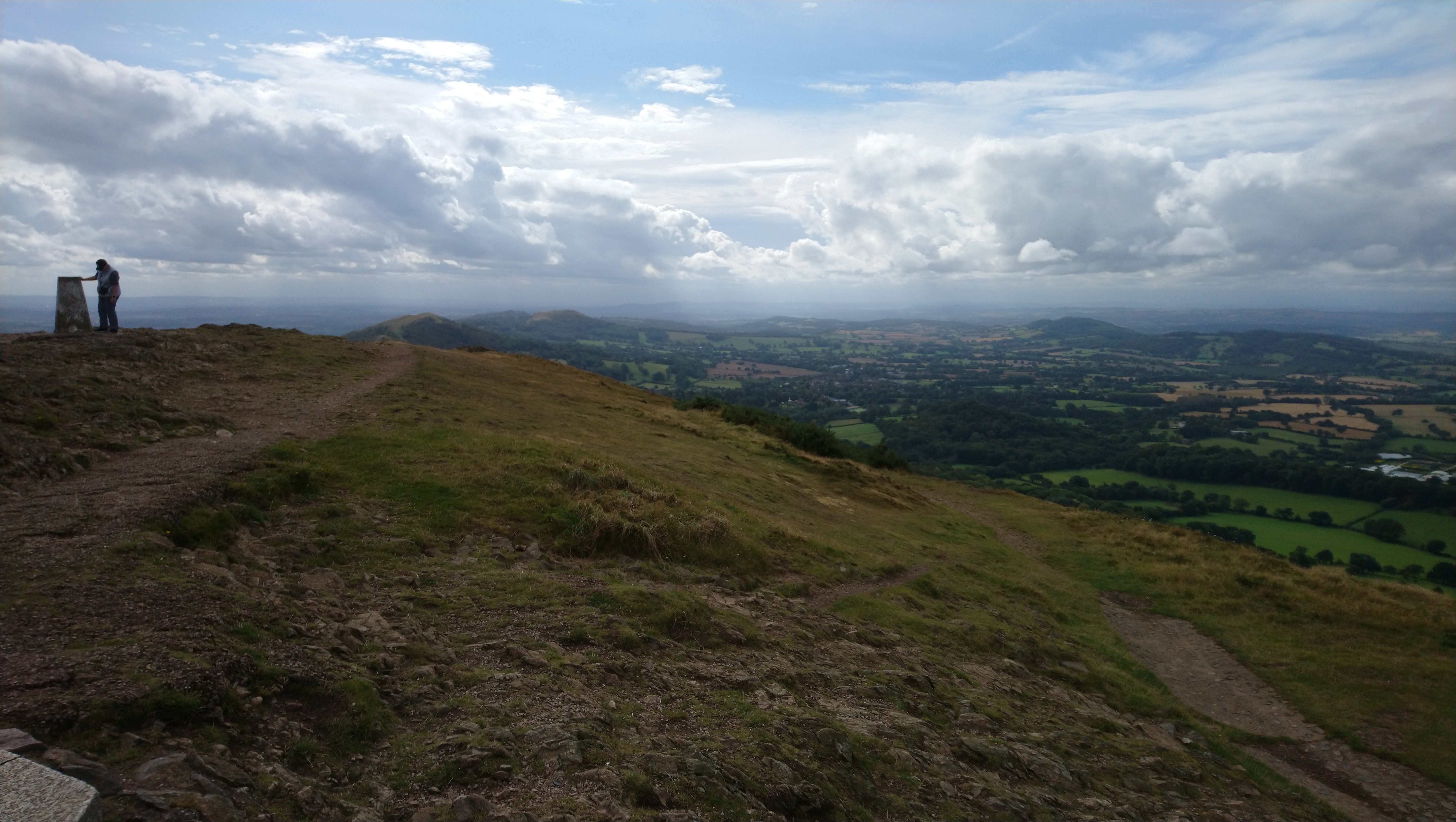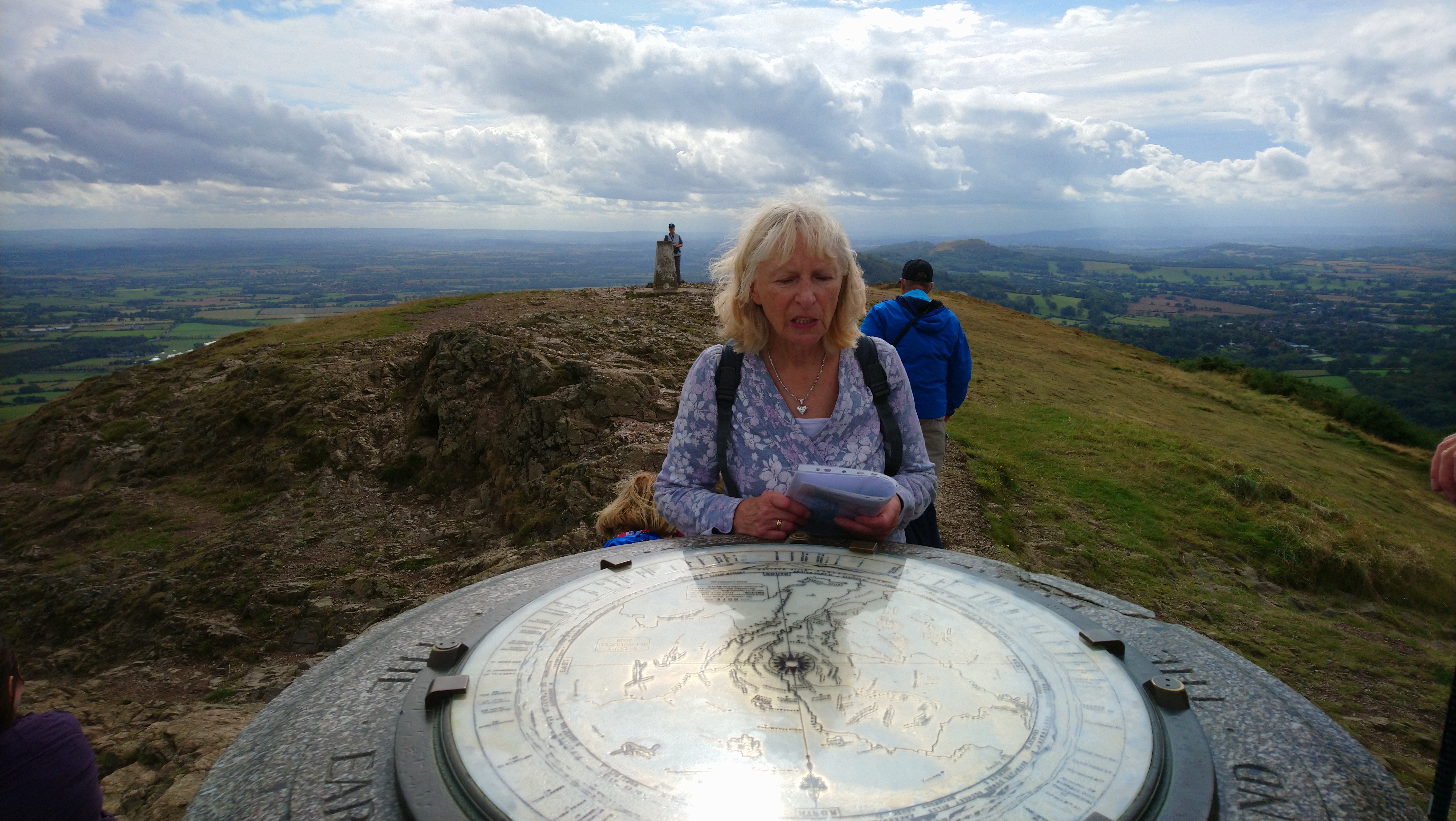 As we neared the Beacon, dark clouds began to gather ominously in the southwest. We stopped in the lee of the Beacon cairn to take photos and enjoy our packed lunch, where we struck up a conversation with some fellow summiteers from Utah, USA. They were in the UK for six weeks, visiting friends in Malvern (which we could see far below us), who had recommended the climb for the views. They were eager to descend before the rain arrived, leaving us to finish our lunch and watch the approaching weather.