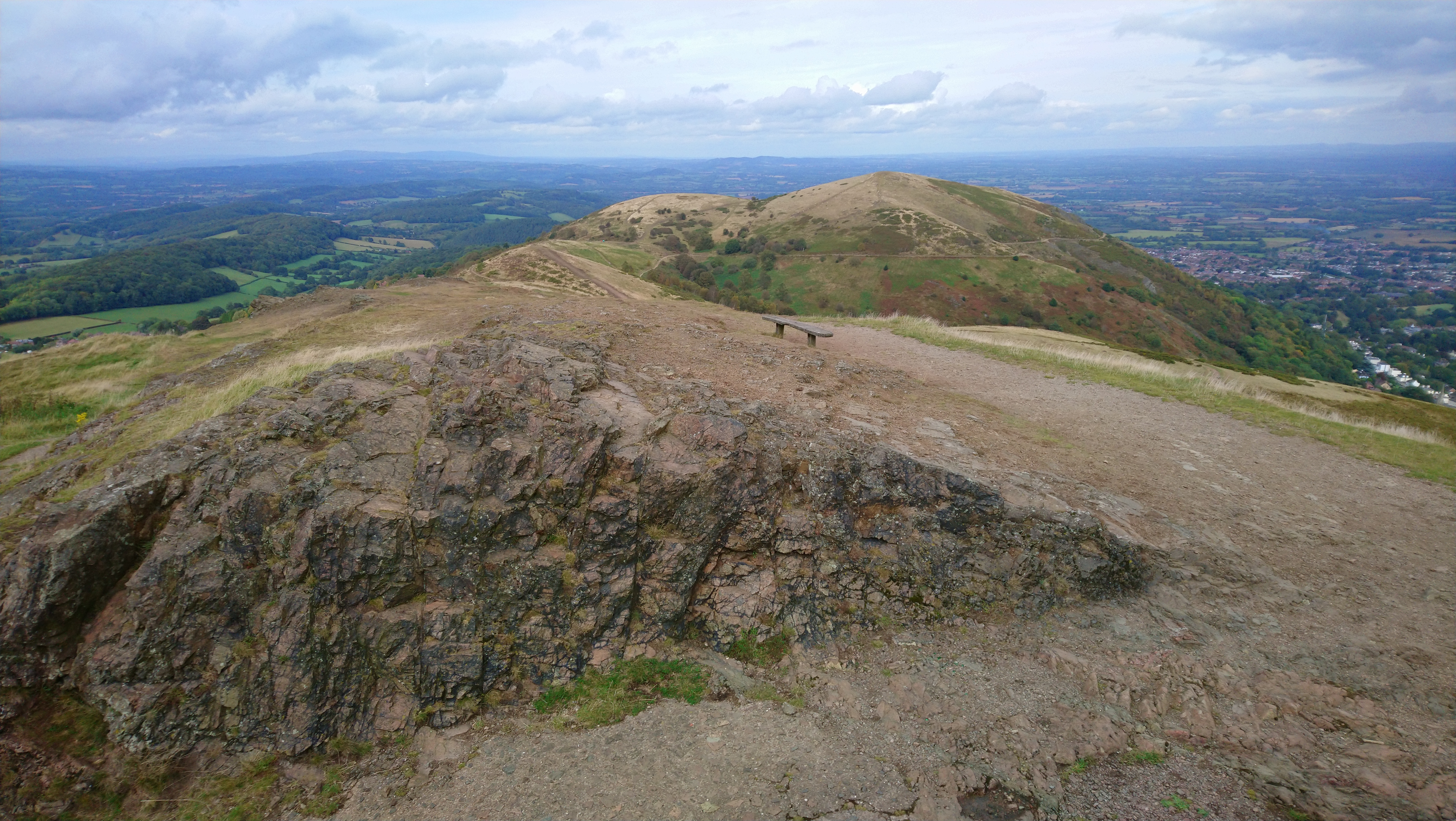 After parking up outside the hotel and changing into more suitable footwear, I loaded our route onto my GPS, and we set off, fingers crossed that the forecast downpour would turn out to be another false prophecy. As we climbed towards the Worcestershire Beacon, the sun broke through, and the views became increasingly magnificent.
