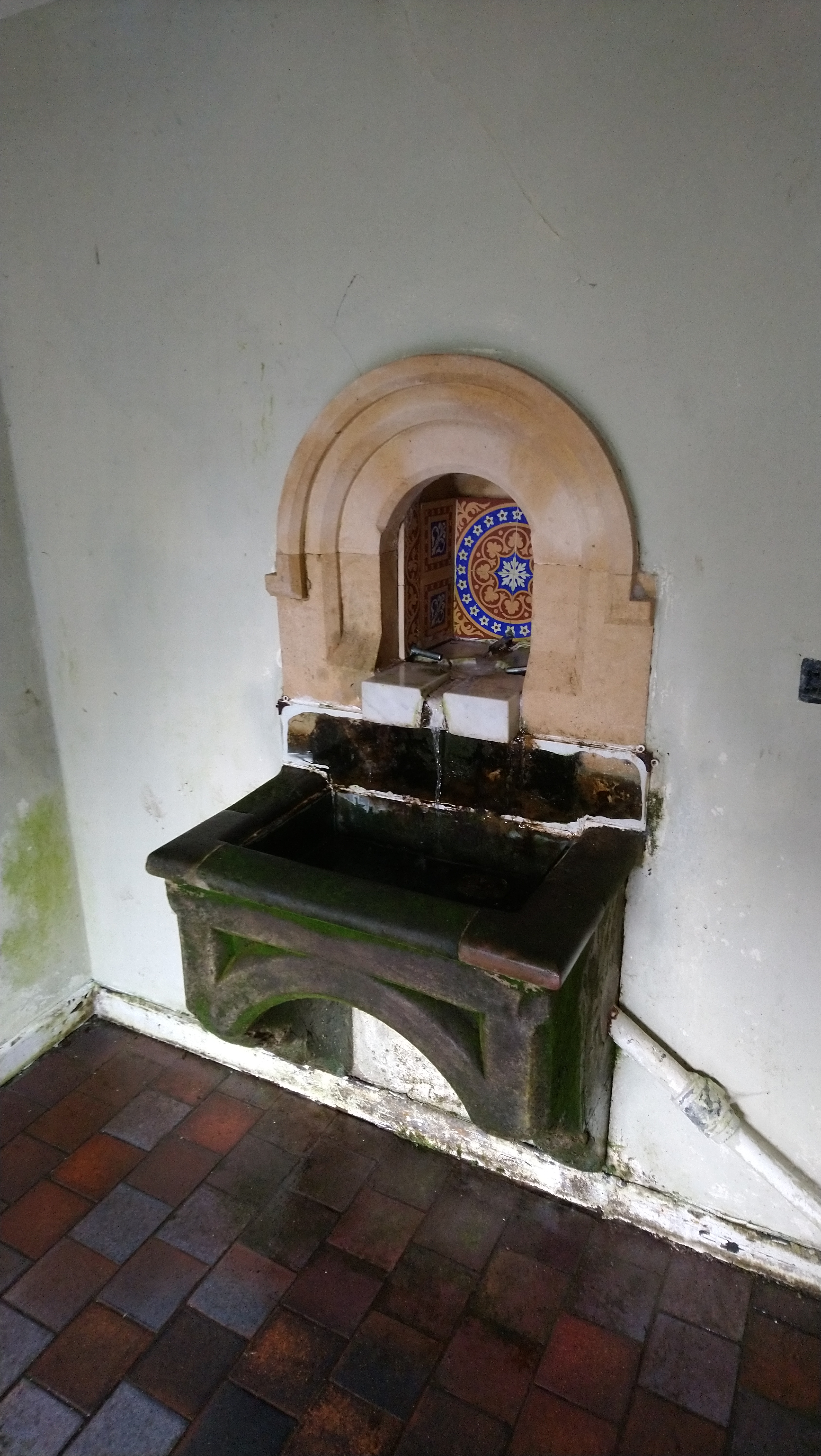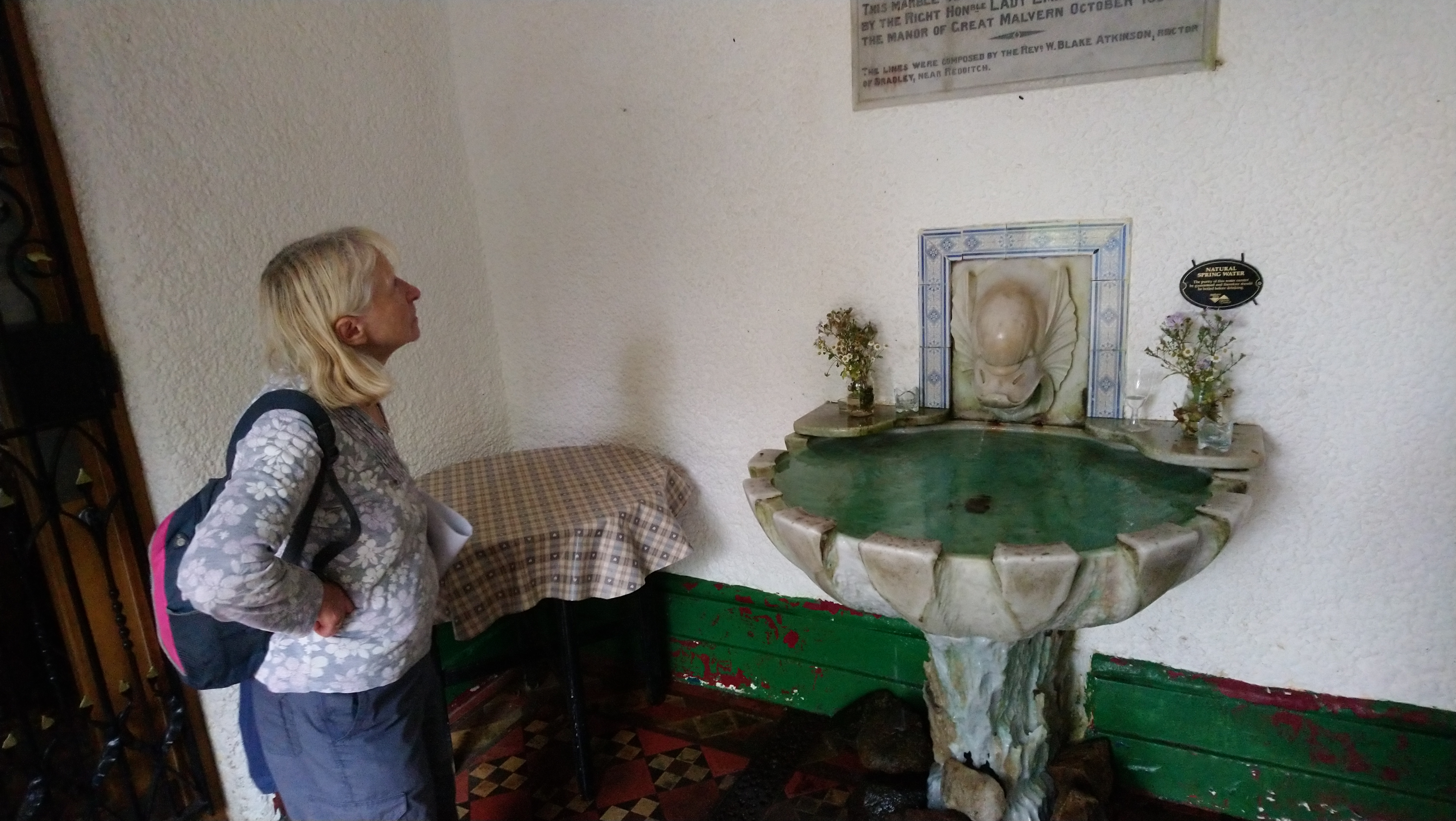 With the forecasted rain still holding off, our next stop was a small, tucked-away cottage, the location of the Holy Well. Like Saint Anne’s Well, its water gushes into a decorative ceramic trough within a small side room attached to the cottage. The earliest records of the well date back to 1558, but it gained particular fame as the source of Malvern Water, supposedly the only bottled water the late Queen would drink.