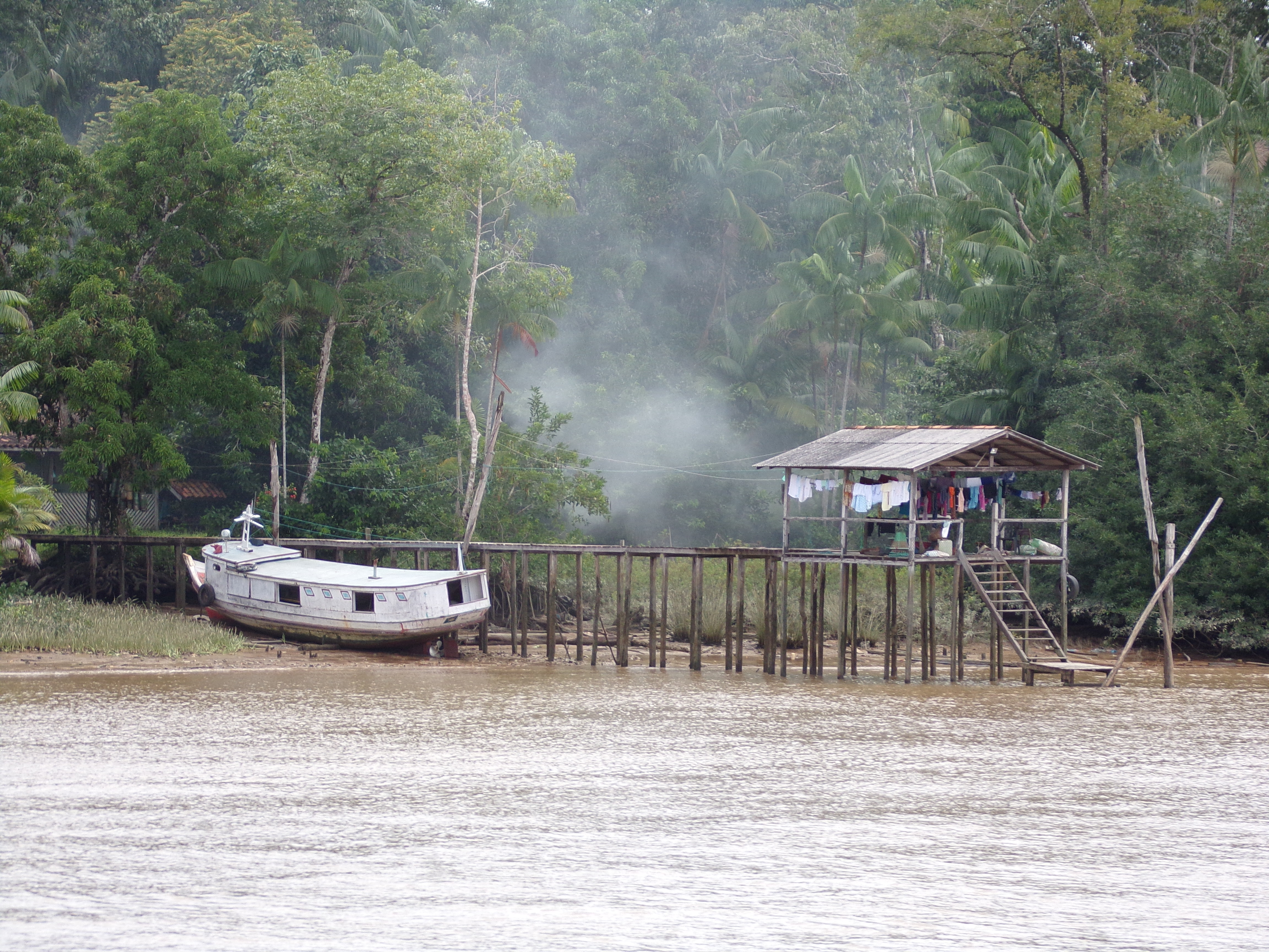 Turning out of the main channel, we glided into the much narrower Guamá River. Here, the rainforest pressed in much closer on both banks. Long stretches of the shoreline were lined with mangrove-like bushes, thin, spindly trunks exposed by the low tide, growing directly from the river mud.