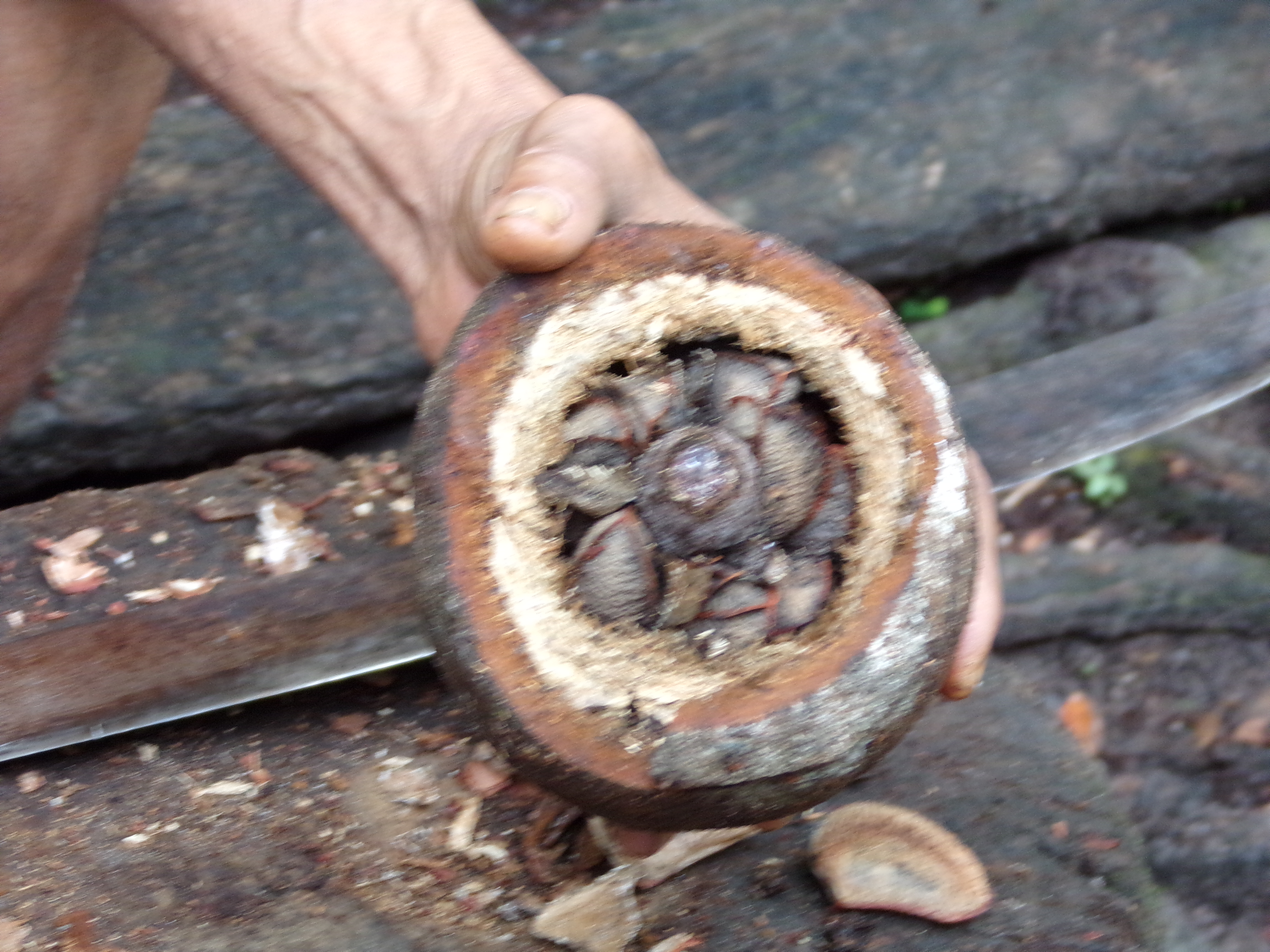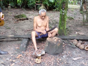 After a short walk to a small cluster of thatched huts, we watched a demonstration by a sprightly old gentleman, dressed only in a pair of tatty shorts, on how to crack open these ‘coconuts’ and extract their contents.