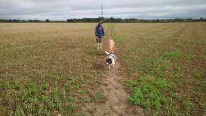 Our canine-accompanied route took us mainly through wet and muddy fields to the nearby village of Osbaston, the trail leaving Mia’s underside coated in a grubby layer of north Leicestershire sludge. A much taller Harry fared better, with just a faint tide line halfway up his legs, barely noticeable against his brown hair.