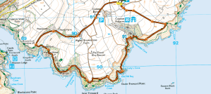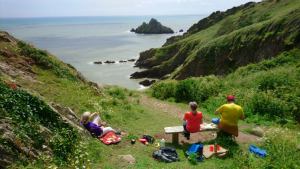 Having taken note of the inclement weather forecast, we had suited up accordingly, but after leaving the gravel car park, it wasn’t long before layers were shed under a clear blue sky and, at times, a fiercely hot sun. We made our way to the coast through a series of closely cropped, undulating grassy fields, each adorned with tall hedgerow foxgloves, before arriving at the cliffs above Ivy Cove. Here, we turned west along the 630-mile National Trail.