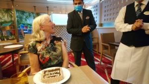 That evening, Sue had a lovely surprise during our meal in the specialist Goan restaurant. Although her birthday wasn’t until the following day, a guitarist and a phalanx of waiters suddenly congregated around our table, presenting her with a birthday cake and launching into a rousing rendition of Happy Birthday. A thoughtful gesture, and no doubt the result of the ship’s staff spotting her birth date in the passport details. They had wisely chosen to celebrate a day early, rather than attempt it over breakfast on disembarkation day.