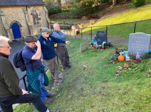 From bus to foot, our nostalgic journey continued with a ramble, first taking in St. John the Evangelist churchyard to see Bill Owen (Compo) and Peter Sallis’s (Clegg) graves in Upperthong. The graves themselves have been adorned with trinkets and offerings left by fans of the programme. From here, we headed up the steep hillside to admire views of the town below and its surrounding rugged landscape. Making our way through several copses along the summit, we headed towards the small village of Netherthong and our destination for lunch. The Pure North Cider Press is located on the grounds of a 200-year-old farmhouse and contains a small shop and cafe selling a wide variety of ciders brewed on the premises, as well as serving food. Here we sampled all of the brews and had lunch. Overall opinion on the ciders sampled was that few of them were to our liking, most seemed to have weird flavour combinations for a cider, and some were just unpleasant. However, the food was good. We returned to Holmfirth by way of the road.