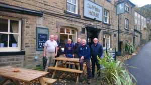 Eagerly, we left Harborough at 10 a.m. in two cars, meeting up for refreshments shortly after leaving the M1 north of Sheffield, before continuing the short distance to Holmfirth. We had lunch and further refreshments at the Elephant and Castle, conveniently situated close to both sets of accommodation. We had driven through drizzle all the way from Leicestershire, but here in Yorkshire, the rain had become much more determined. Consequently, with only a little reluctance, we deviated from our planned itinerary, an orientation walk around Holmfirth’s Heritage Trail, and instead chose to sample a few more northern brews in the warmth and comfort of the pub.