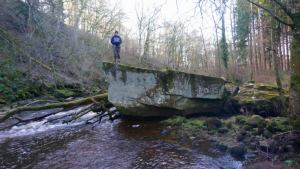 The stone is reached by a steep, treacherous side path that quickly descends through trees perched high above the watercourse. Deftly negotiating the descent, we found ourselves beside the subject of so much artistic musing. We guessed that this lump of limestone had originated from the cliffs far above the opposite riverbank millennia ago, tumbling its way down to its present resting place.