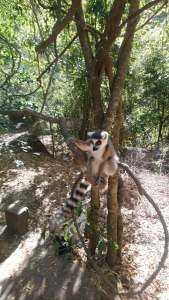 A clearing in a wooded area had been prepared to furnish our group with food and drinks, and we were soon sitting, devouring zebu skewers, chicken legs, and rice salad. Very soon, the smell must have wafted on the breeze and attracted a troupe of Lemurs onto the roof of our gazebo and surrounding trees.