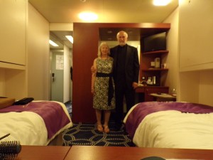Our cabin, located high on Deck 11, is the last one at the stern of the ship, at the end of a very long corridor. It’s incredibly convenient for accessing most of the ship’s facilities and, hopefully, will be quiet and stable. The night will tell!