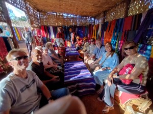 All too soon, it was time to leave. Our coach was parked near several racks displaying woven village garments, and we took the opportunity to support the local economy by purchasing some of the more colourful items on offer.