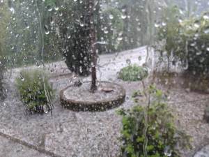 On Sunday afternoon, as the festivities were winding down and the popular (and very noisy) funfair continued in Welland Park, the drought of the past four weeks came to a dramatic end with a tremendous thunderstorm. The skies turned black, the temperature hovered around 30°C, lightning flashed, and thunder rolled, the wind whipped up to near hurricane strength, and hailstones the size of golf balls rained down, flattening the unprotected flowers and vegetables I had so carefully nurtured over recent weeks.