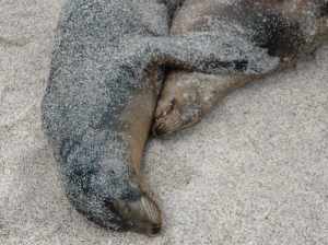 The sandy beach beyond sloped steeply down to a barrier of scattered rocks, over which the waves rhythmically frothed before creeping a little way up the shore, then easing back into the calm, blue Pacific. Naturally, sea lions were everywhere, most of them dozing at the water’s edge, but a noisier few were cavorting in the surf beyond the rocks. A handful of humans had also sought refuge from the sun beneath the low bushes that bordered the top of the beach.