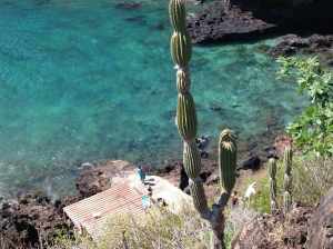 The path from the Interpretation Centre winds its way through the volcanic landscape and is a real pleasure to follow. The walking is mostly easy, although the latter section becomes quite steep. Along the way, the shrubs and cacti make for lovely scenery, but you have to tread carefully to avoid their needle-sharp spines. Just below the summit, there’s a viewing platform, from which we enjoyed splendid views over the town and seascape, and managed to capture some excellent photos of frigate birds in flight. From the summit itself, we spotted a statue of Charles Darwin standing atop a smaller hill to the left of a rocky bay nestled beneath our viewpoint. That was our next destination.