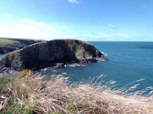 The sea had calmed since the previous day, and though we scanned the surface eagerly, we didn’t spot any of the seals that were supposed to be giving birth at this time of year. All we saw were three ships far out in the distance, which soon disappeared from view. The path was popular, and we encountered quite a few other walkers. For a while, we accompanied a couple from Mold in North Wales, but just short of Abercastle, we let them press on as they needed to catch a bus, while our route took us inland.