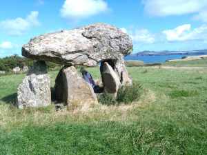Moving on, our final stop came after spotting a sign announcing a burial chamber. A slight detour of around ten minutes from our intended route proved well worth it. After a short walk along a well-trodden path through fields clinging to the side of a string of coastal hills, we were amazed to come upon Pentre Ifan, a Neolithic exposed burial chamber. What we see today are the bare bones of a burial chamber that would originally have been covered by an earthen mound. The giant 5-metre ‘capstone’ appears precariously balanced on three ‘uprights’, yet it has remained in place for over 5,000 years. The surrounding Preseli Hills tower above, the source of the famous Pembrokeshire ‘bluestones’ that were used in the construction of Stonehenge, as well as Pentre Ifan itself.